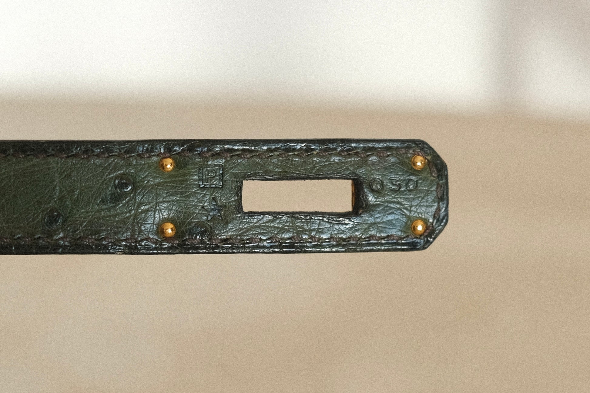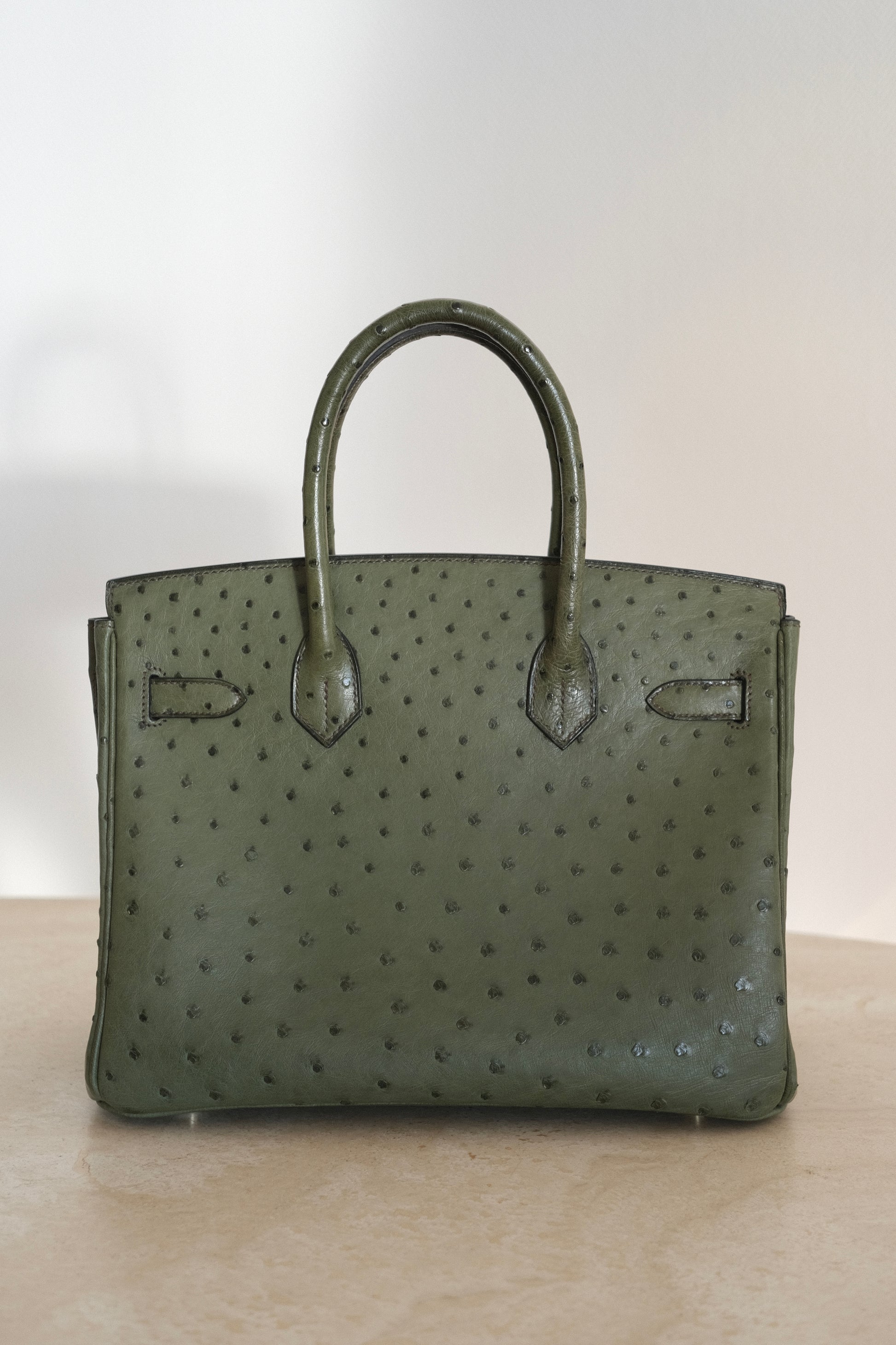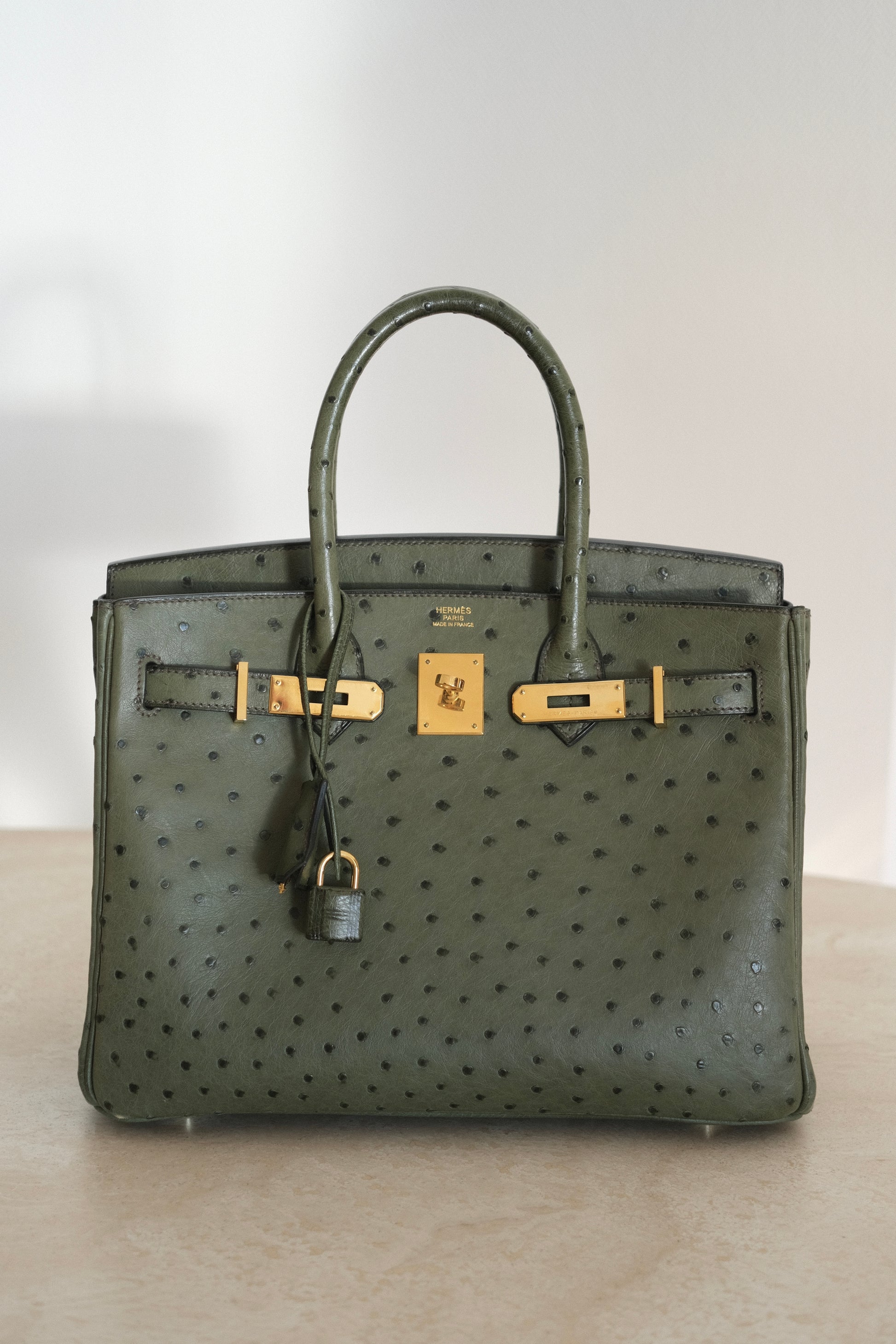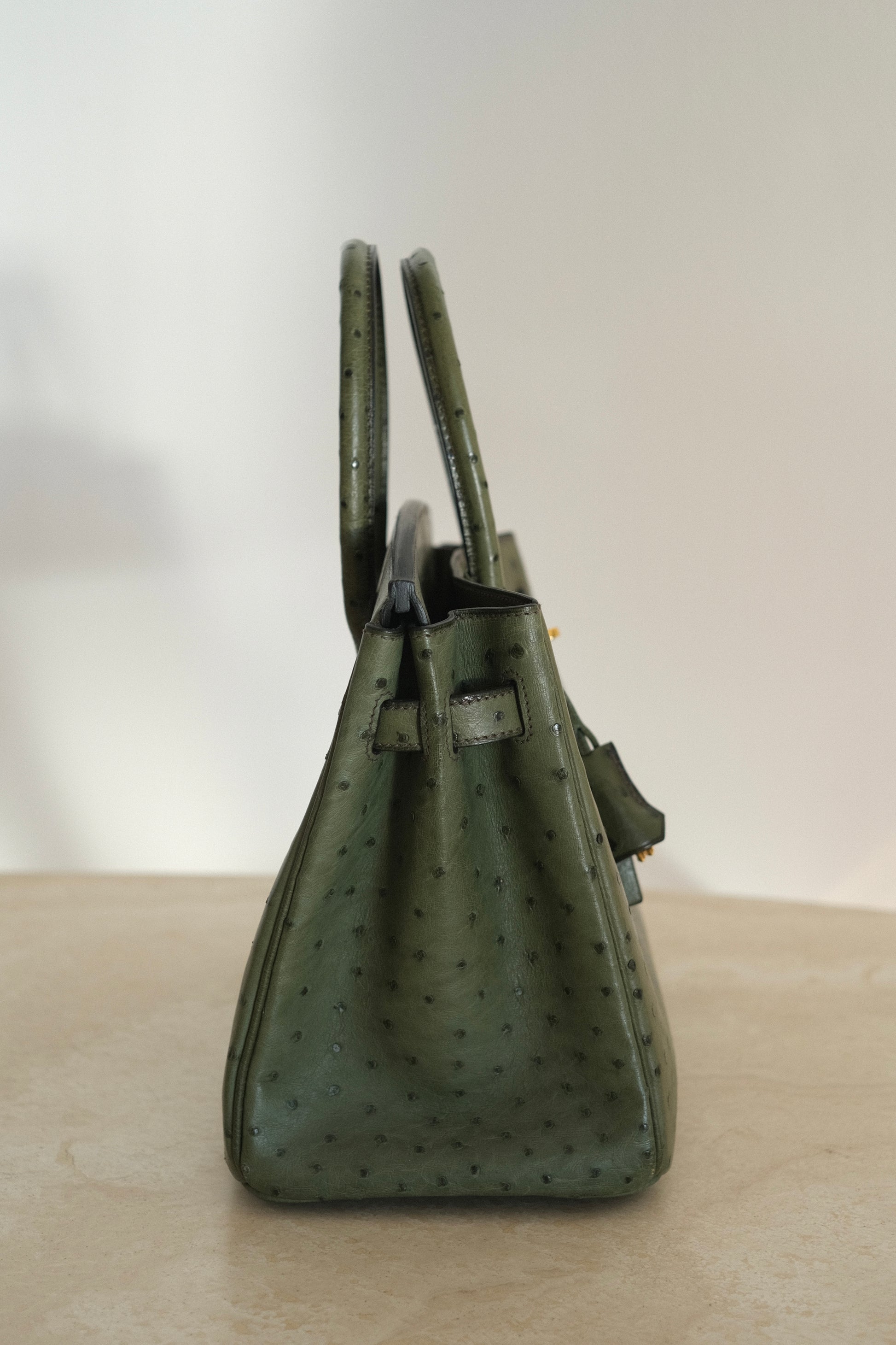 Birkin 30 bag in green ostrich leather and gold hardware with its bell and padlock.