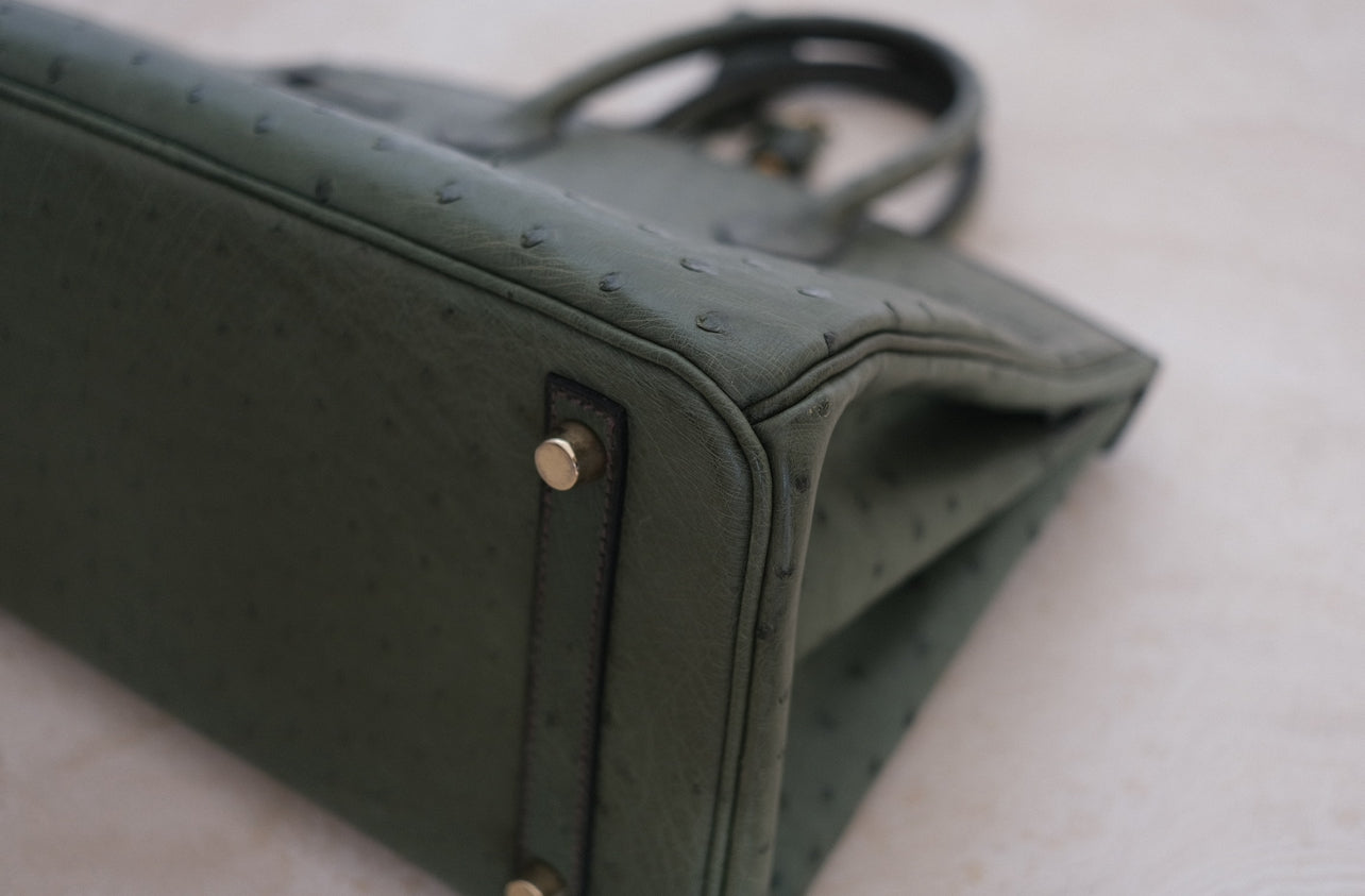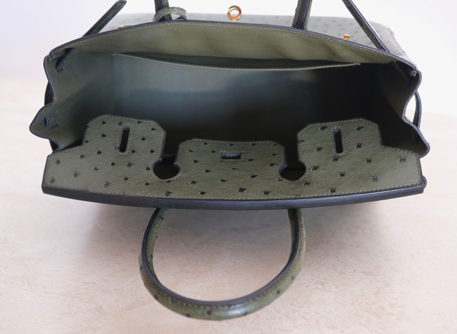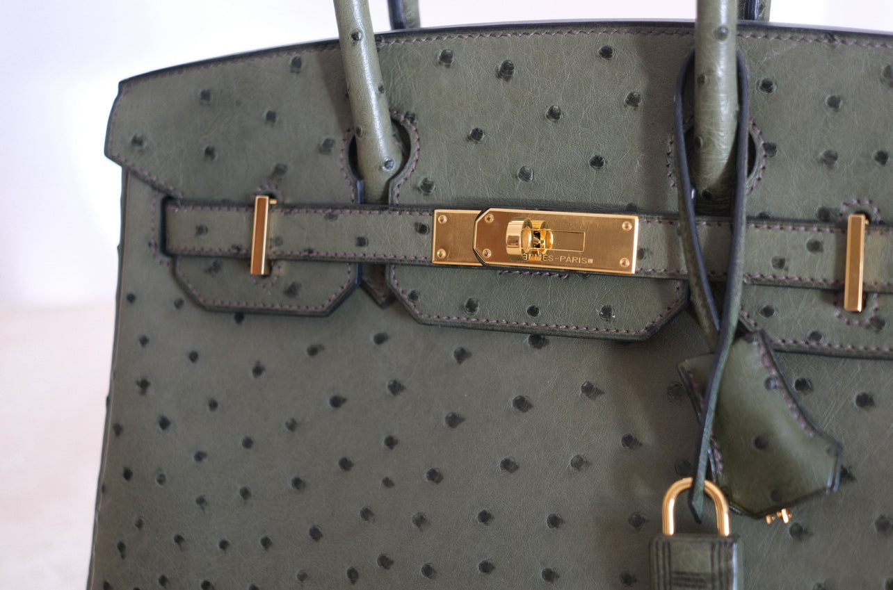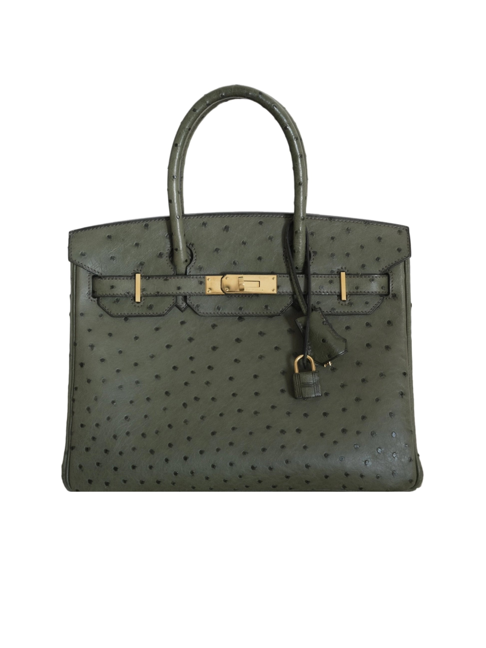 Birkin 30 bag in green ostrich leather and gold hardware with its bell and padlock.