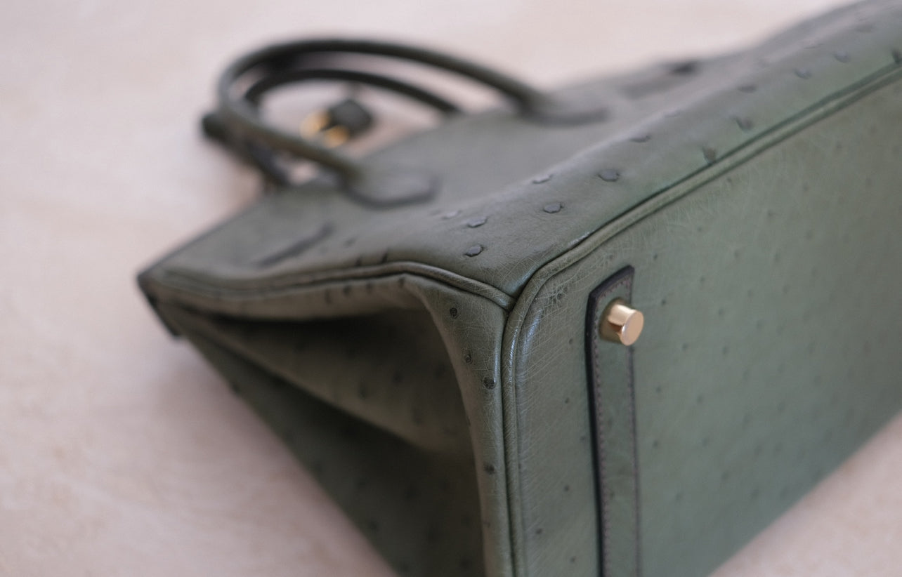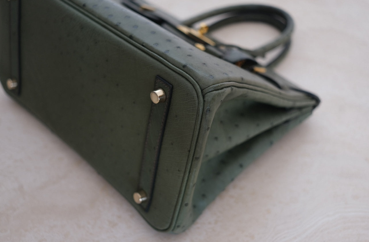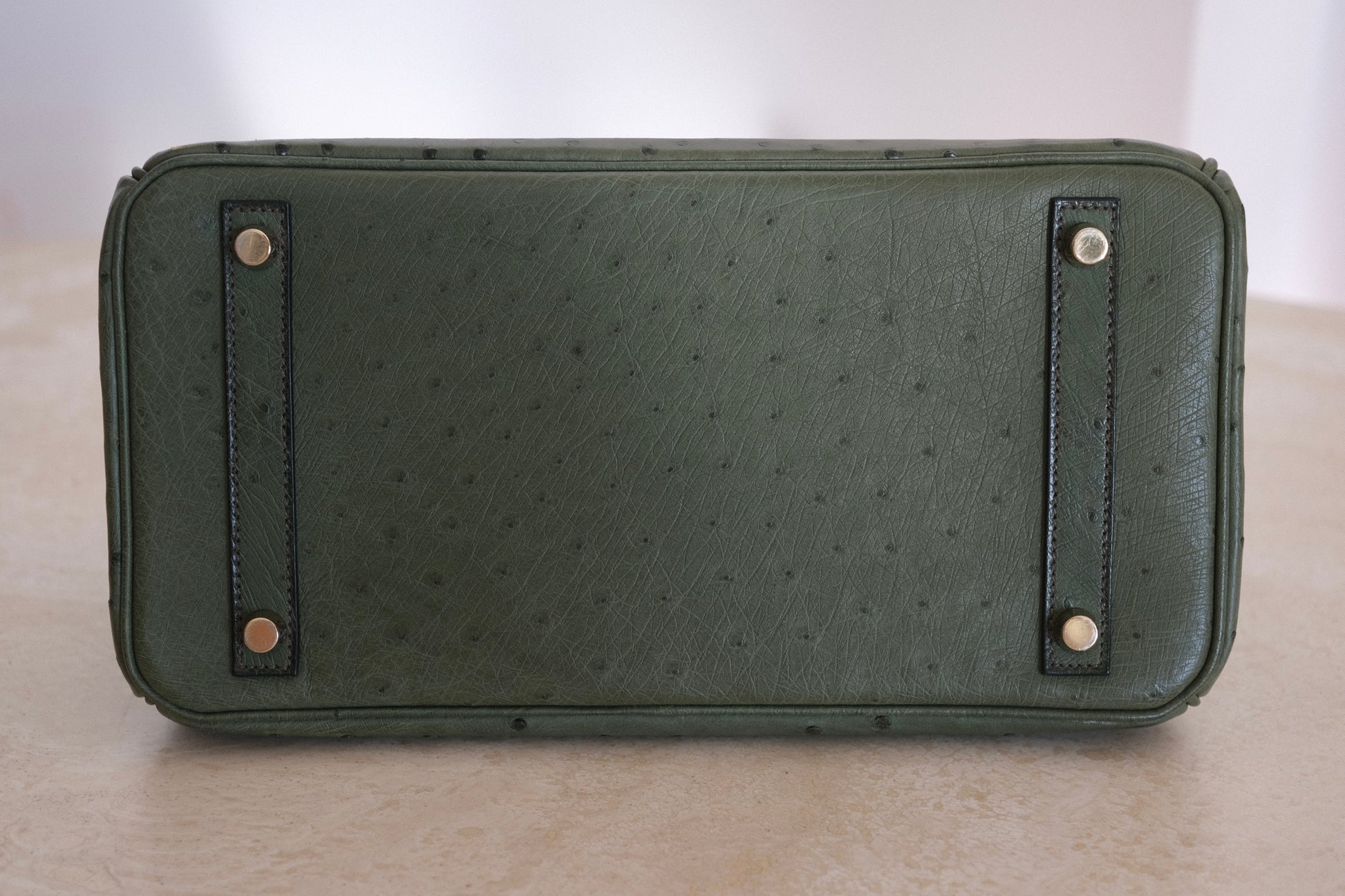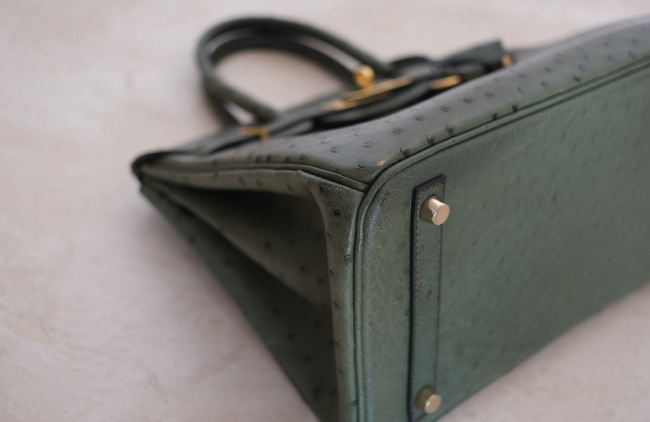 Birkin 30 bag in green ostrich leather and gold hardware with its bell and padlock.