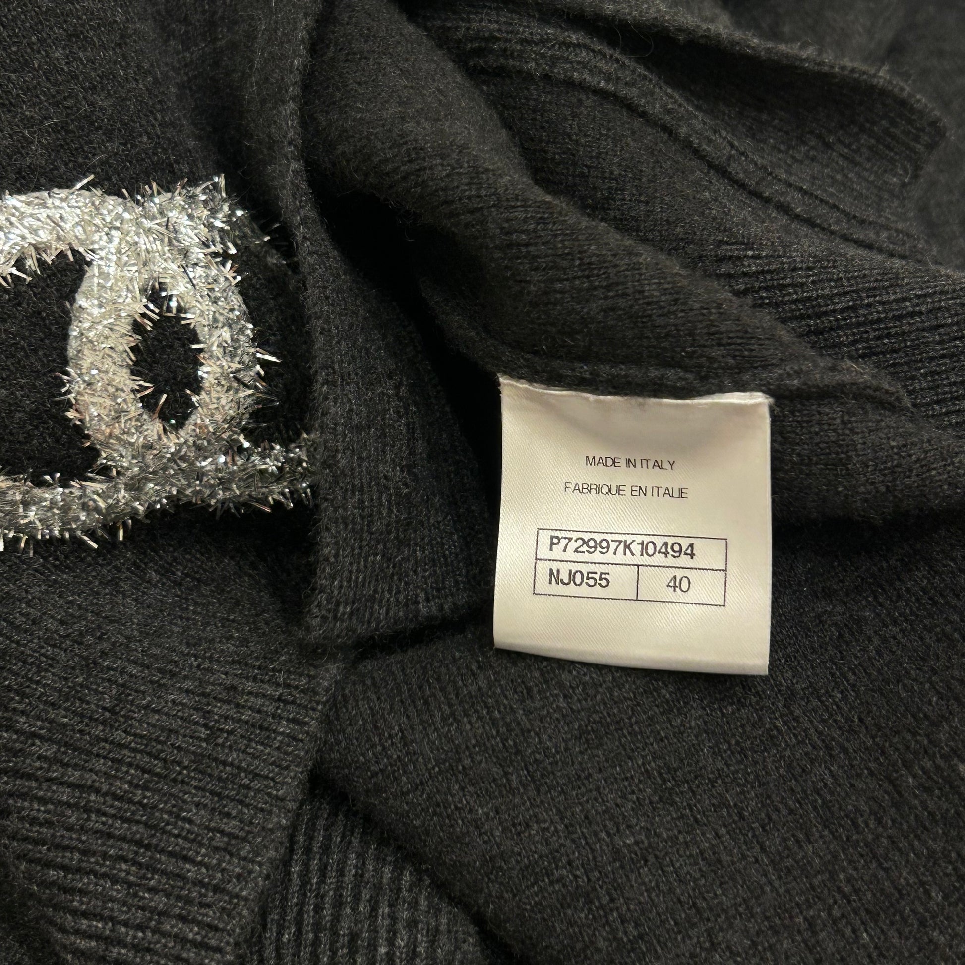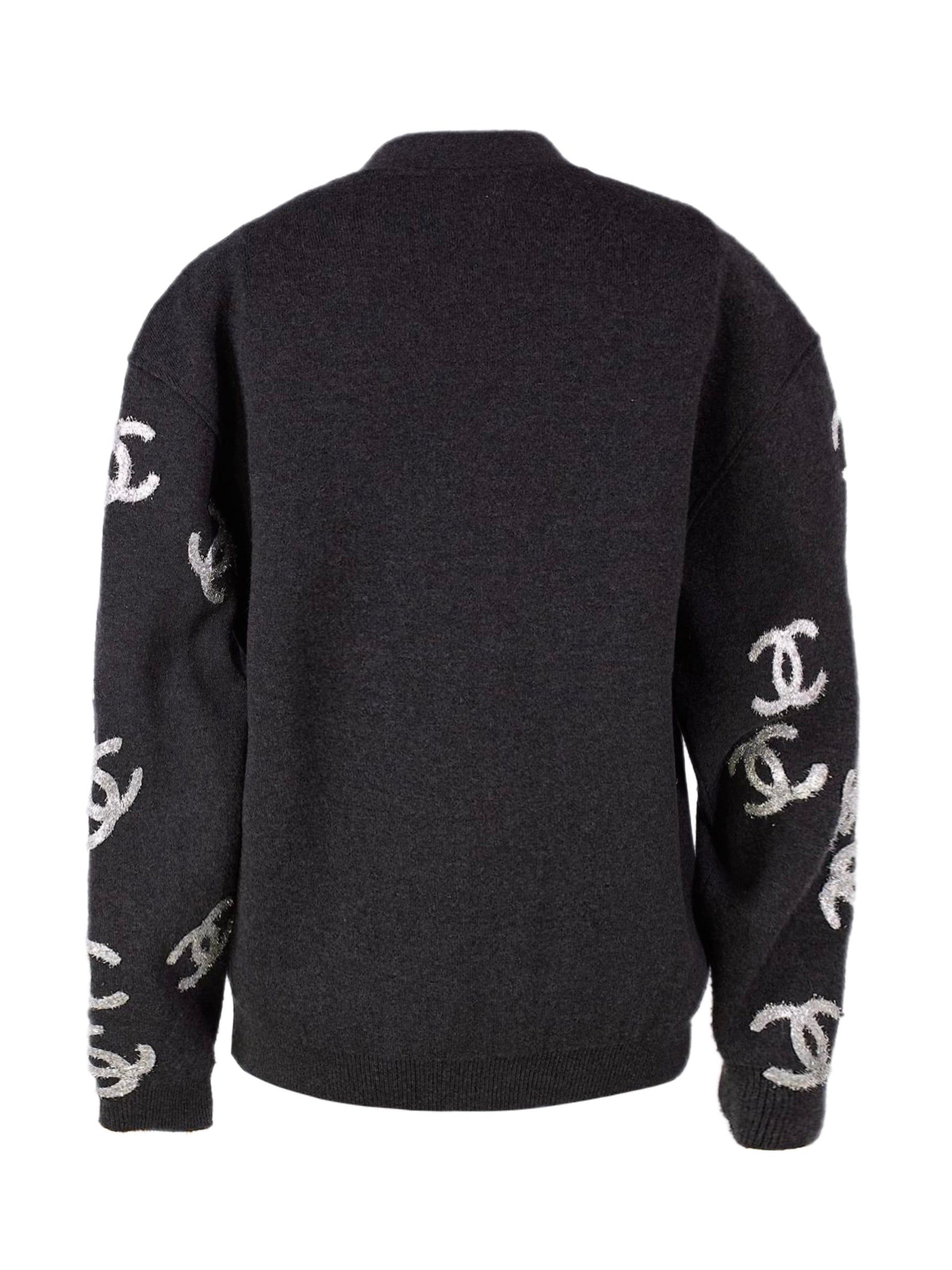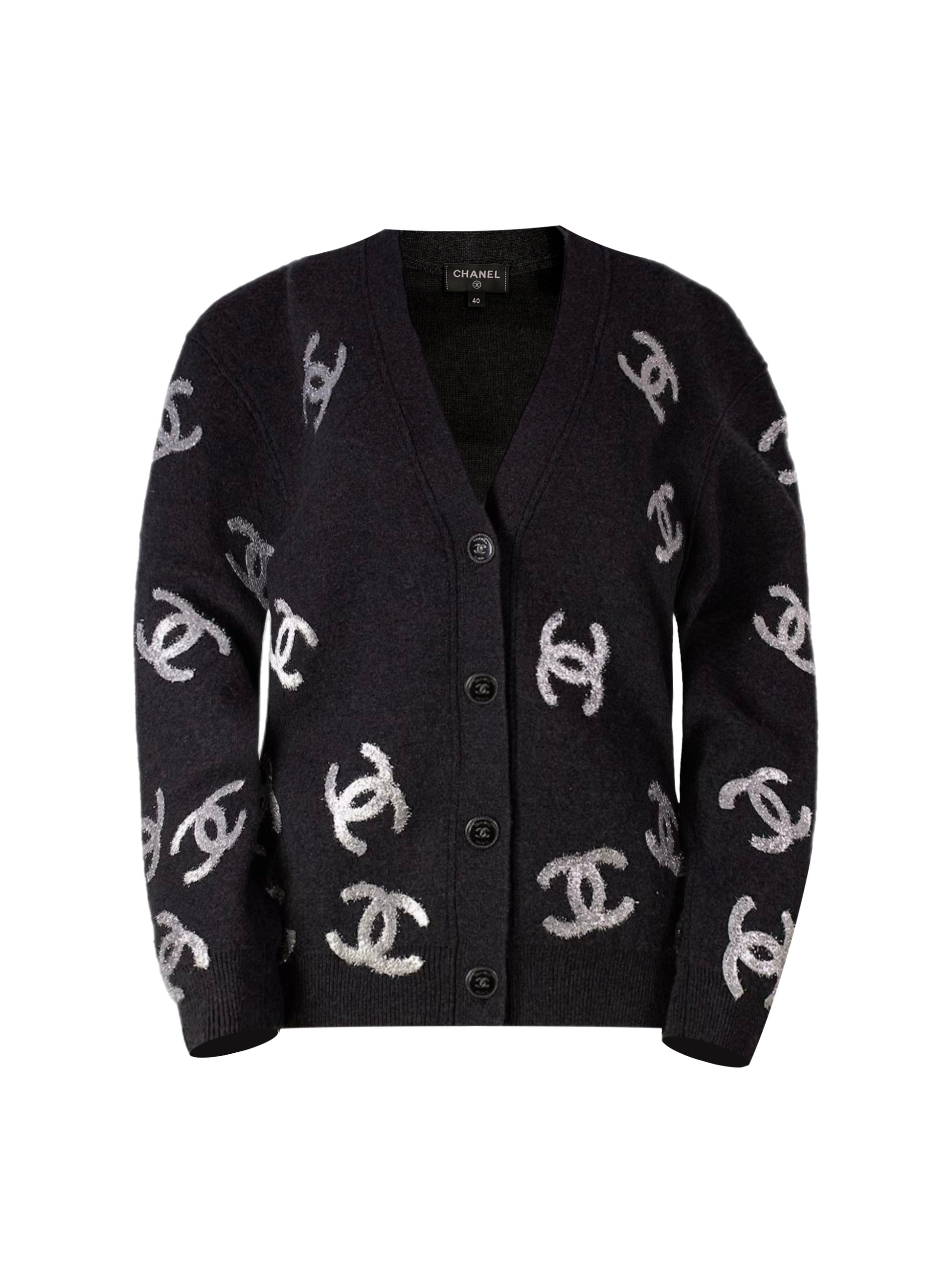 Iconic cashmere Chanel cardigan with sparkling CC logos.