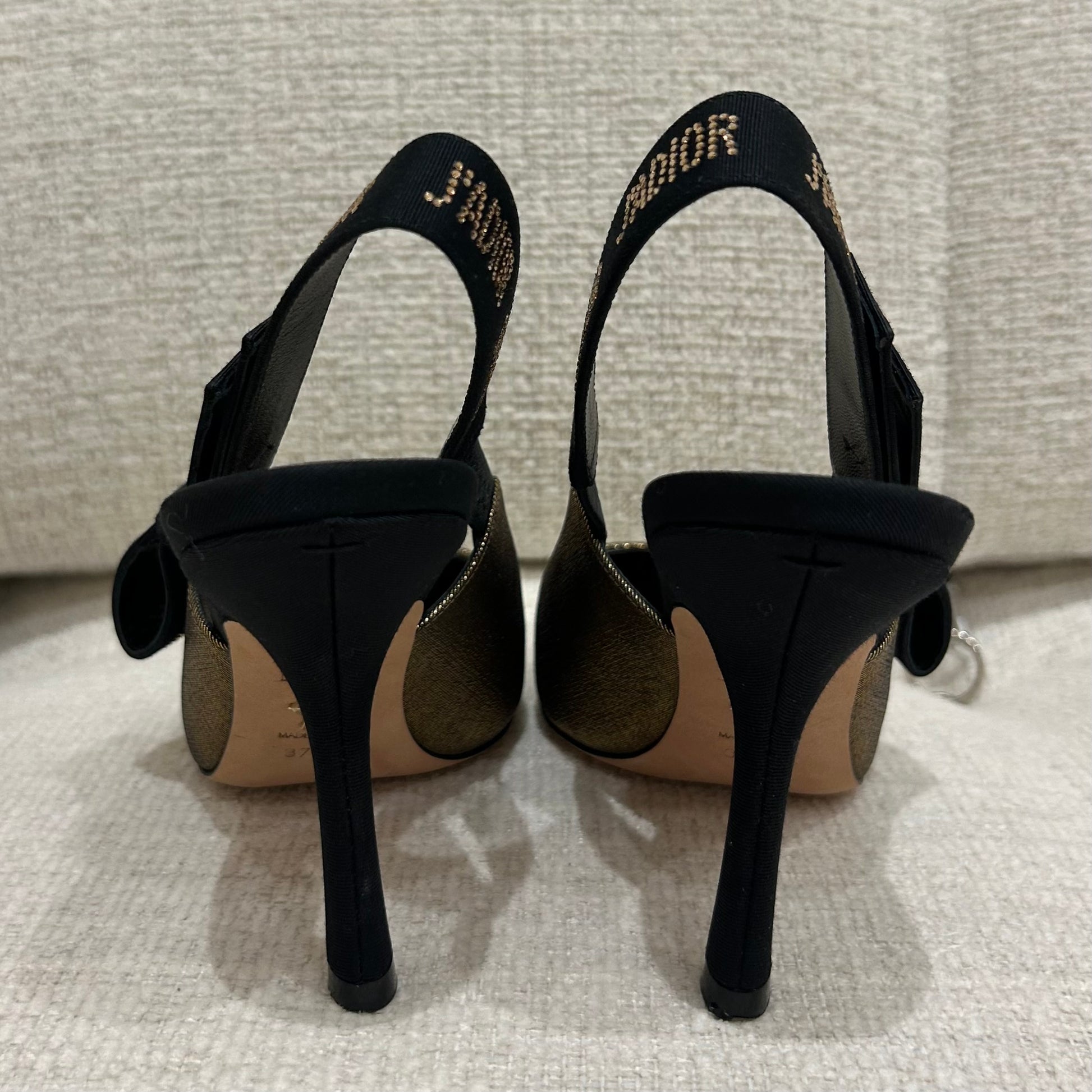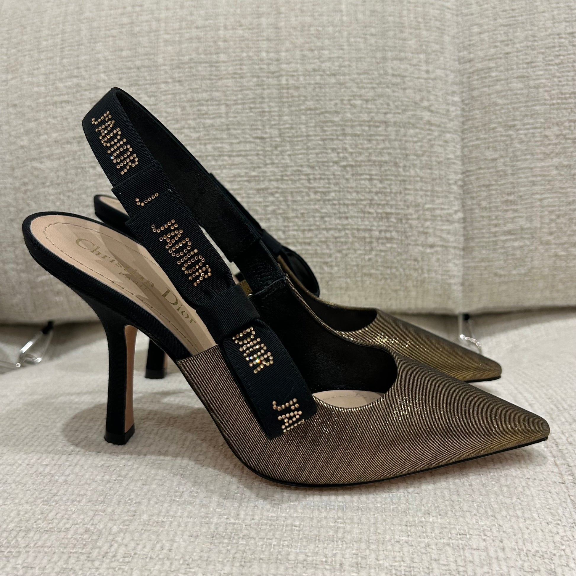 J’Adior slingback pumps in iridescent gold fabric with gold crystal details on black suede leather.