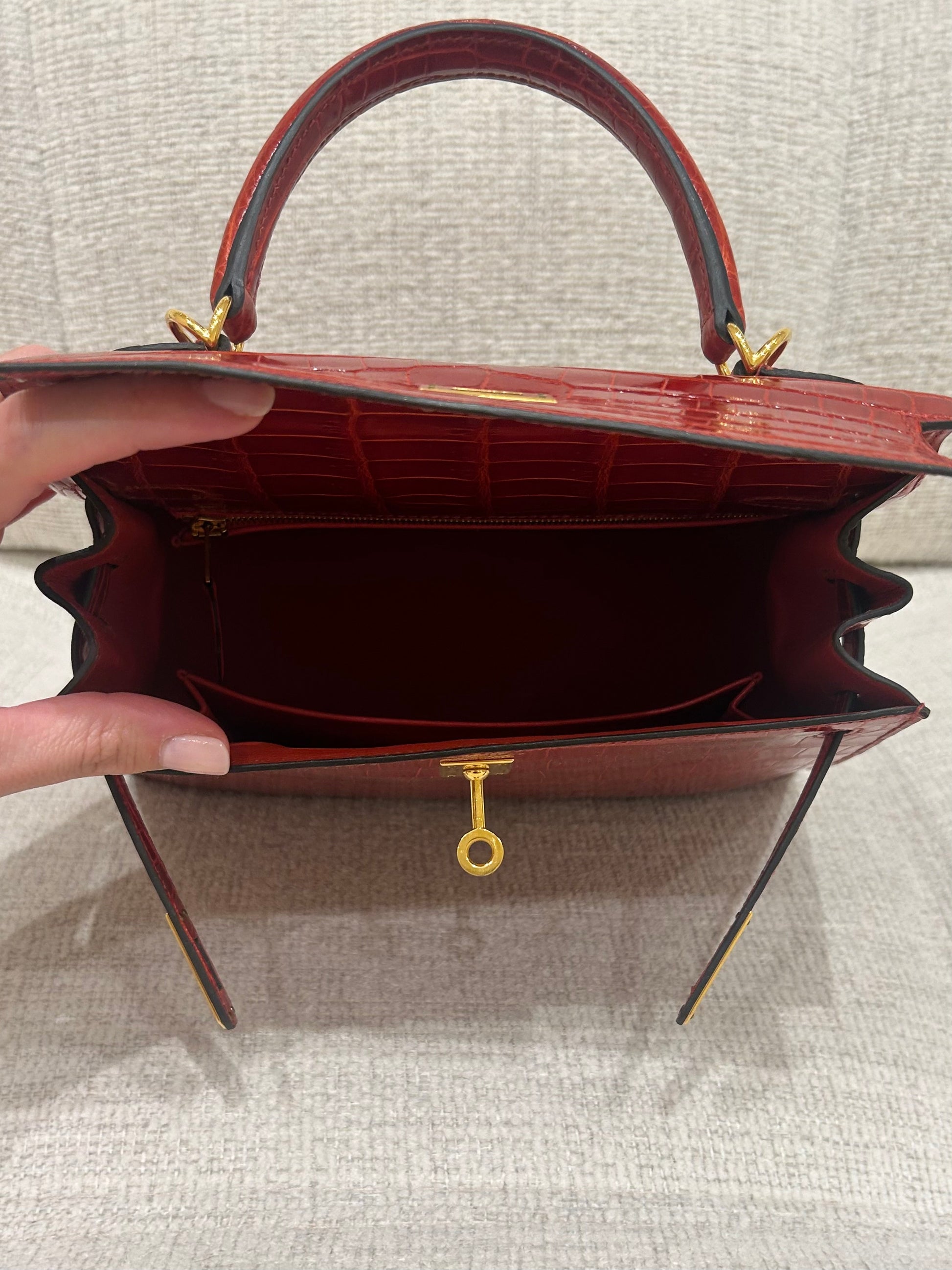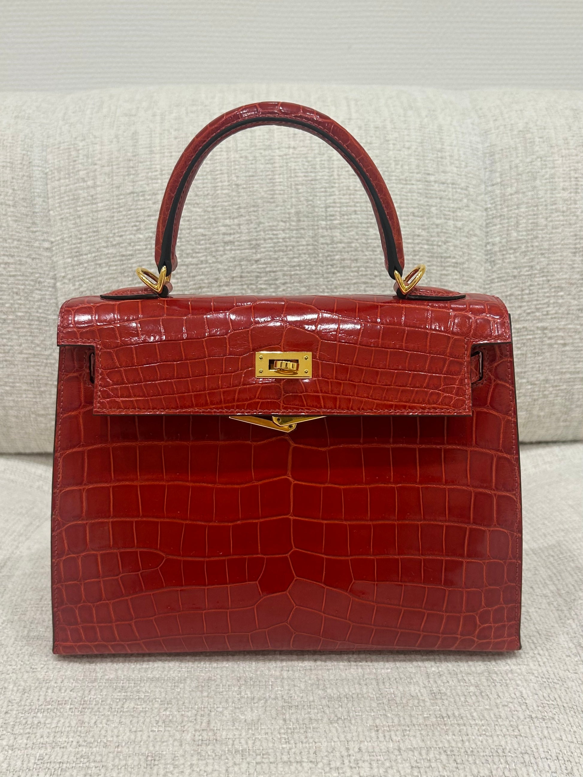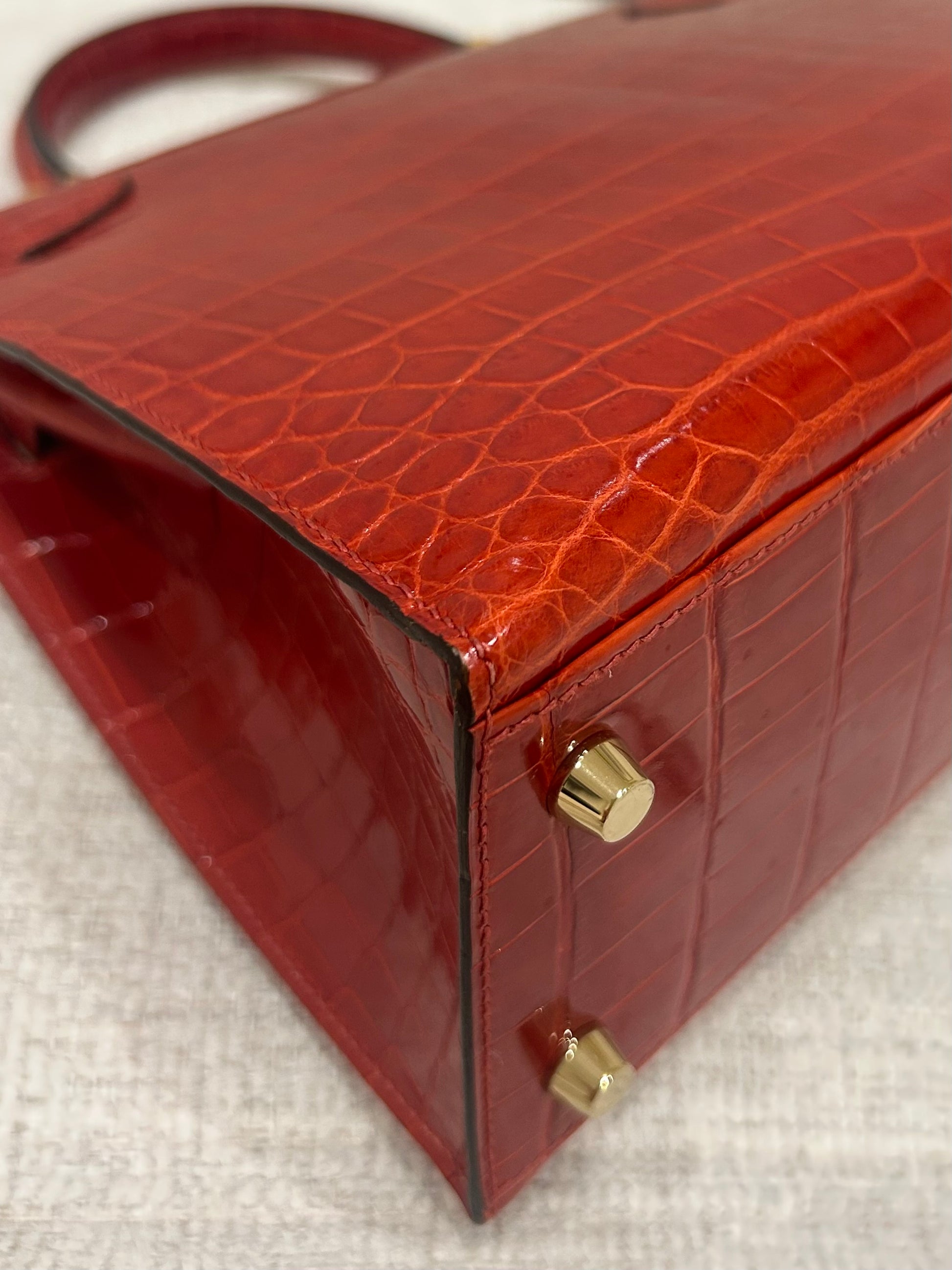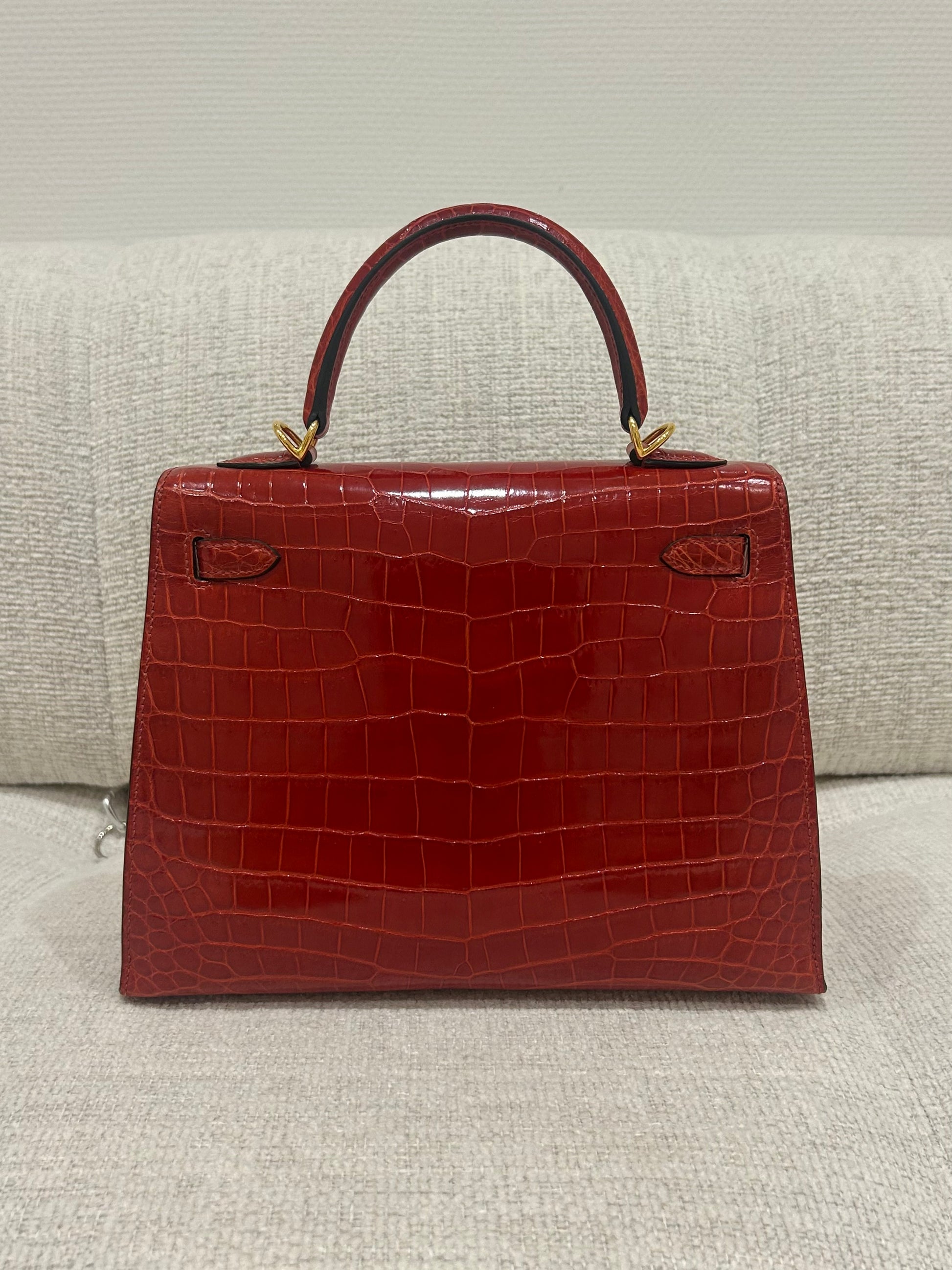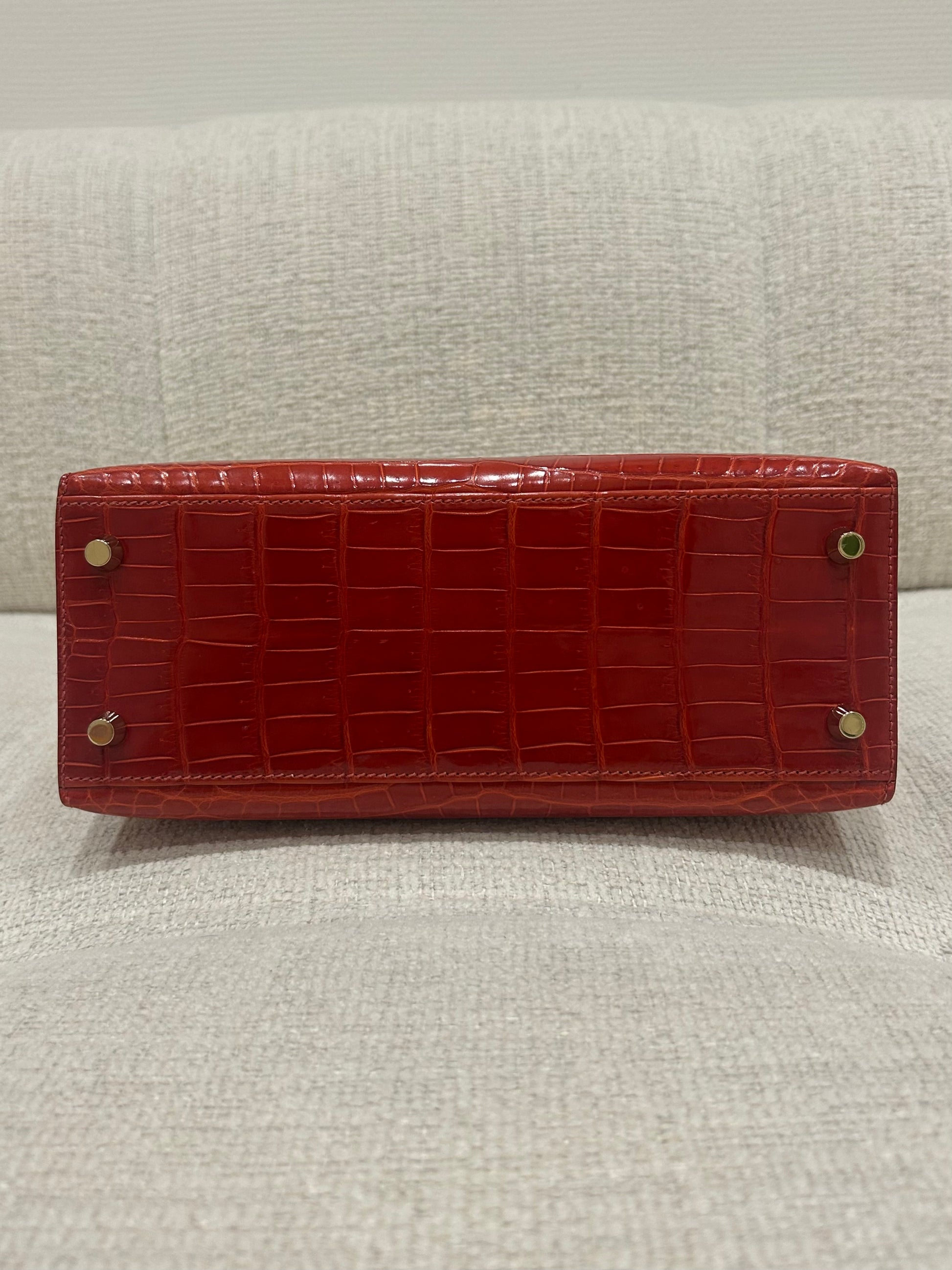 Kelly 25 in Orange Sanguine shiny crocodile with gold hardware. Sold with strap, padlock trimmed with leather, keys, clochette and dustbag.