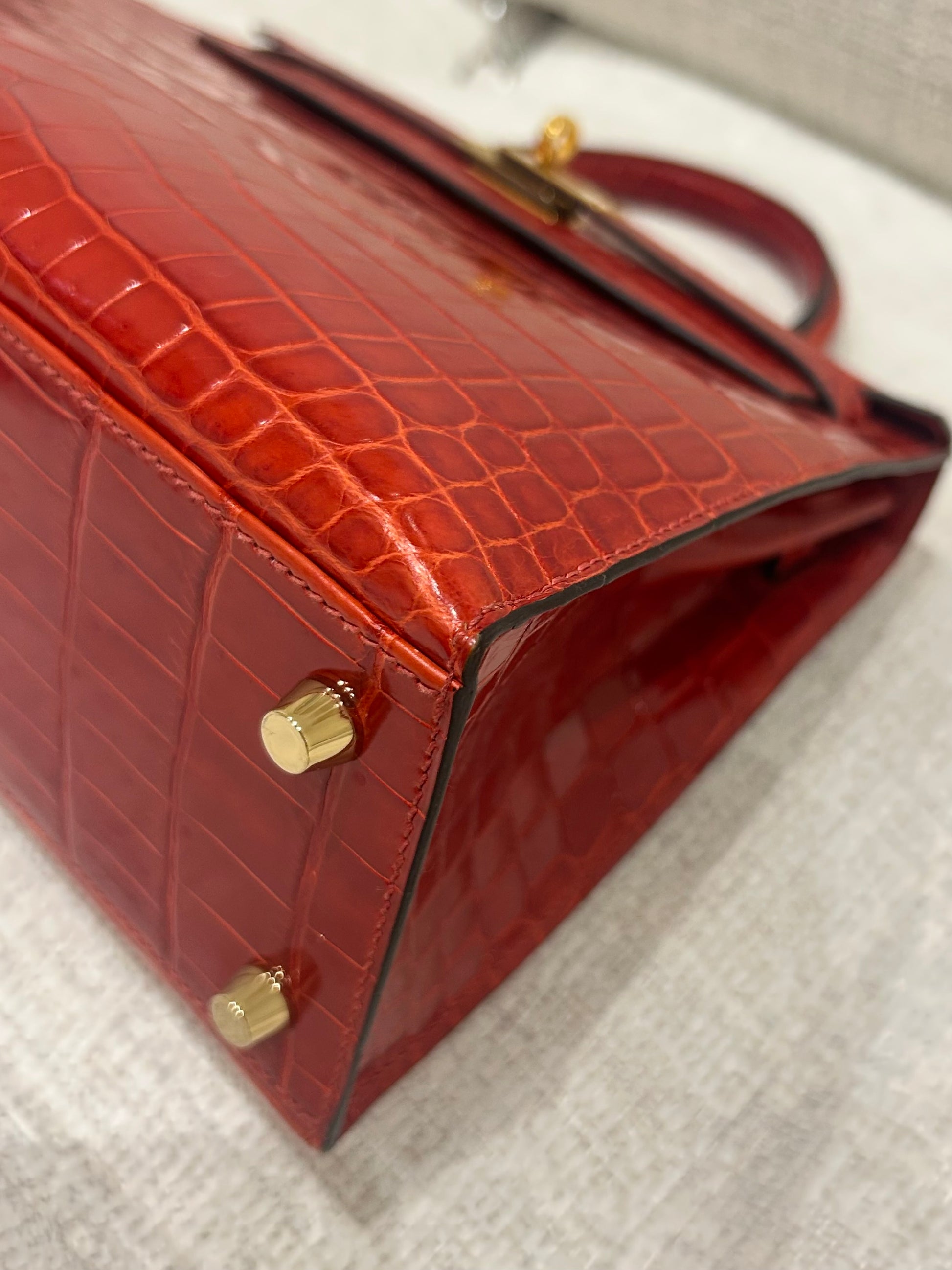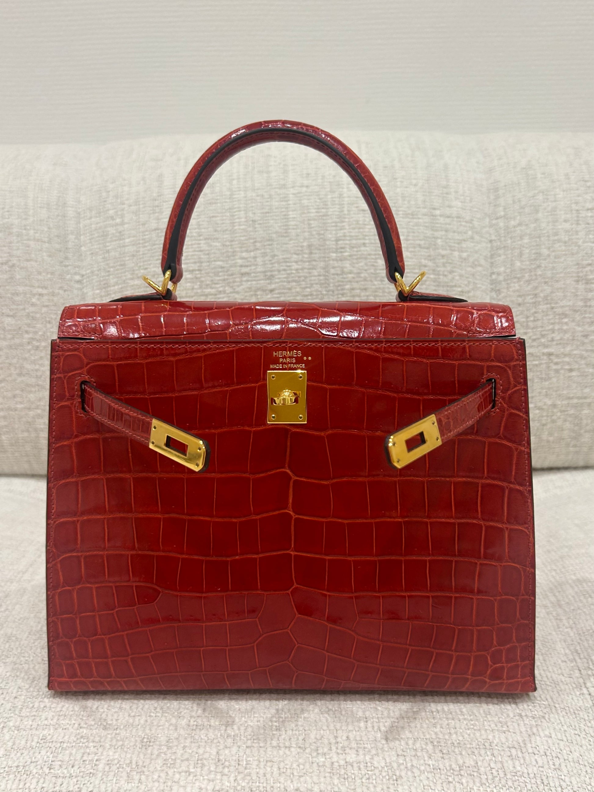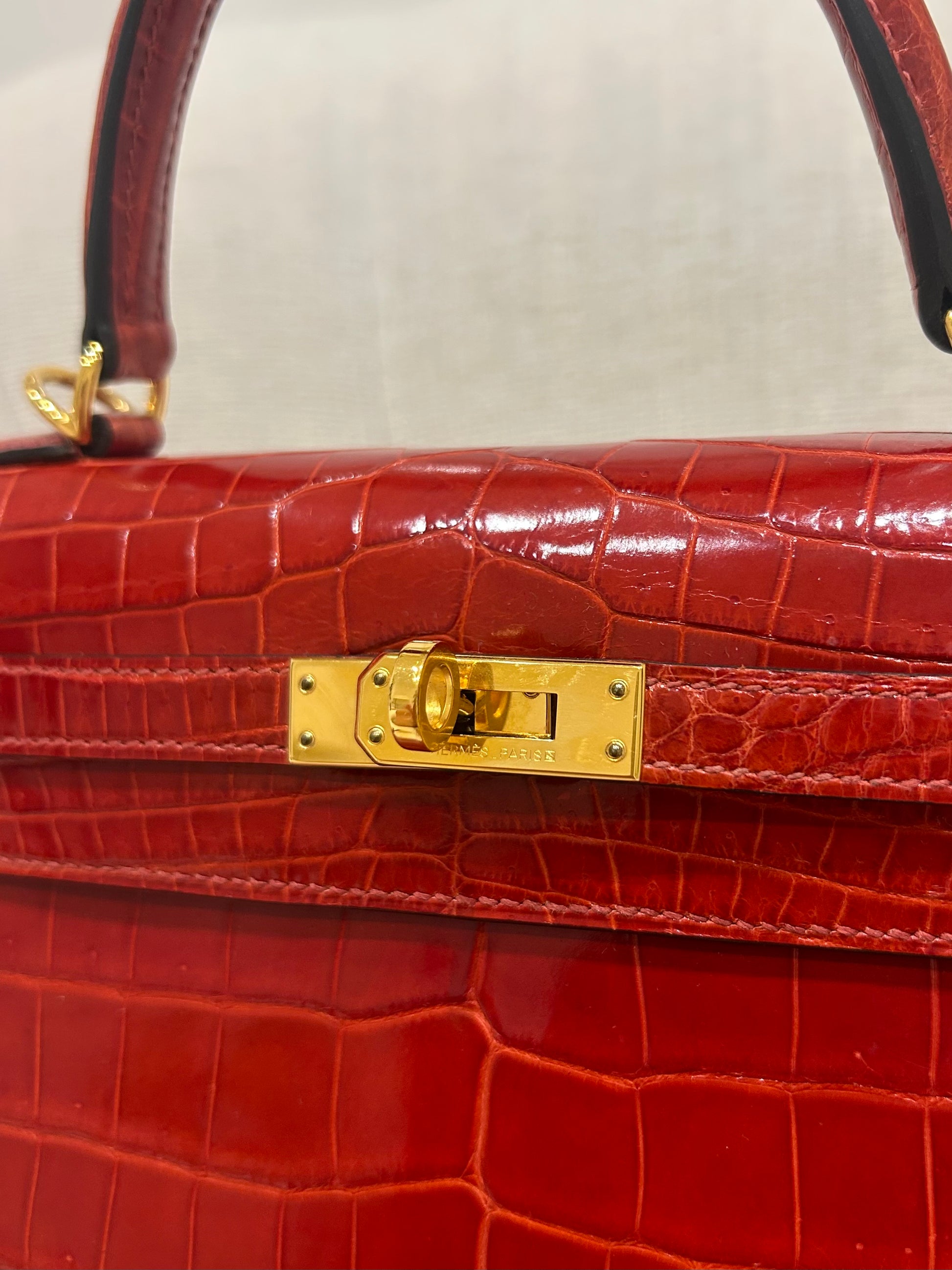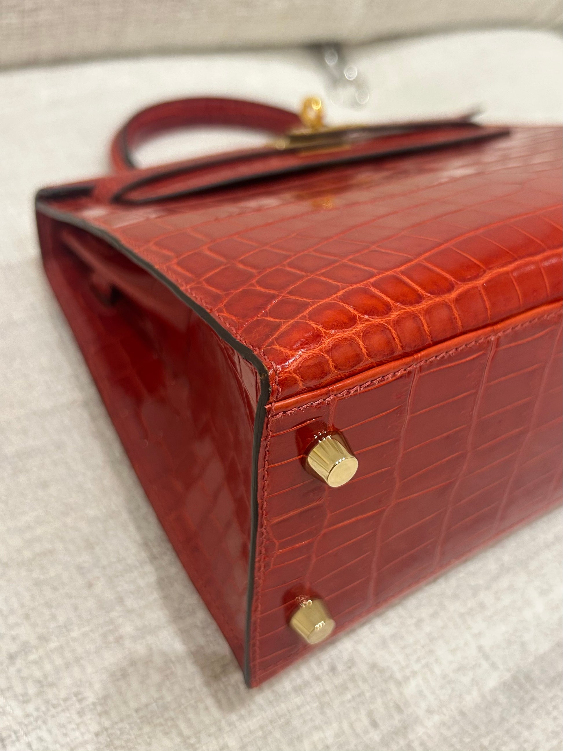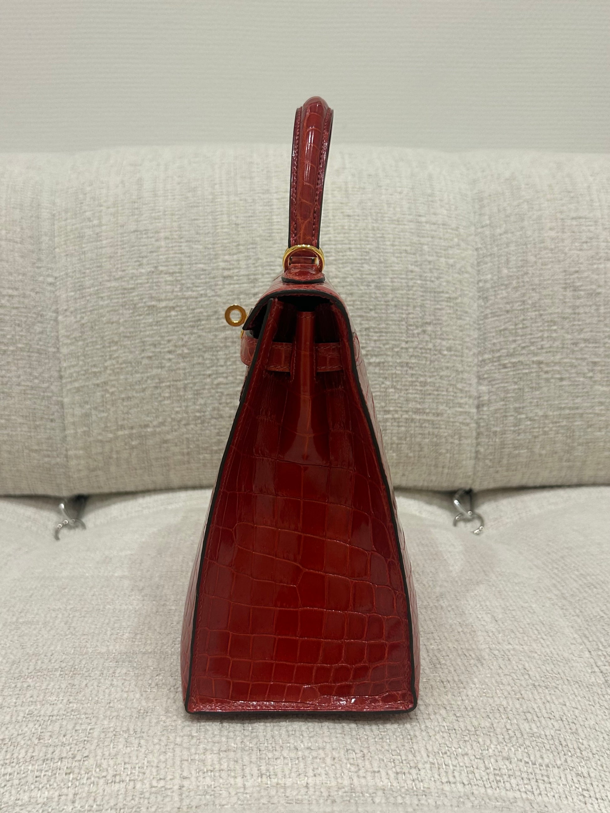 Kelly 25 in Orange Sanguine shiny crocodile with gold hardware. Sold with strap, padlock trimmed with leather, keys, clochette and dustbag.