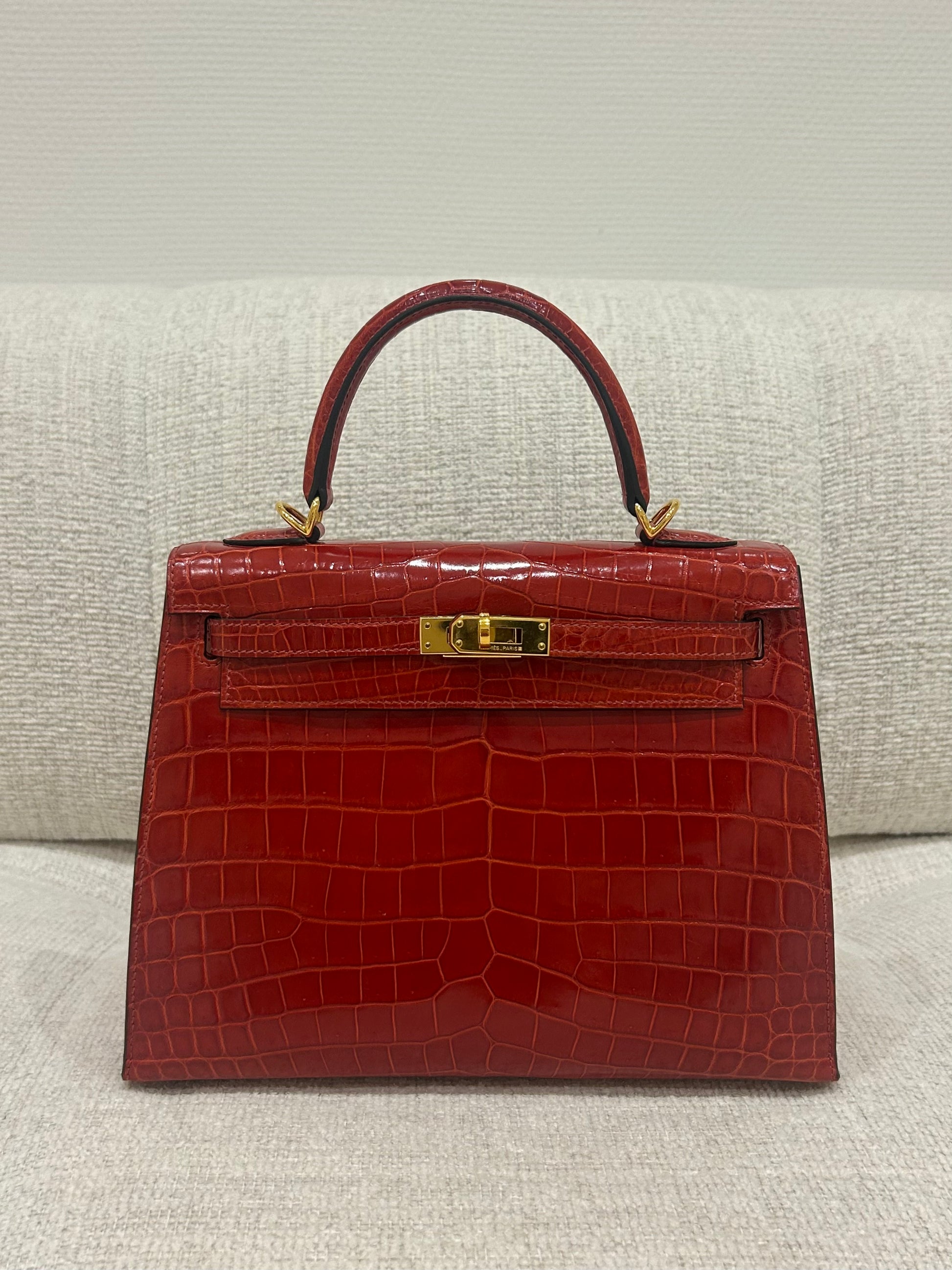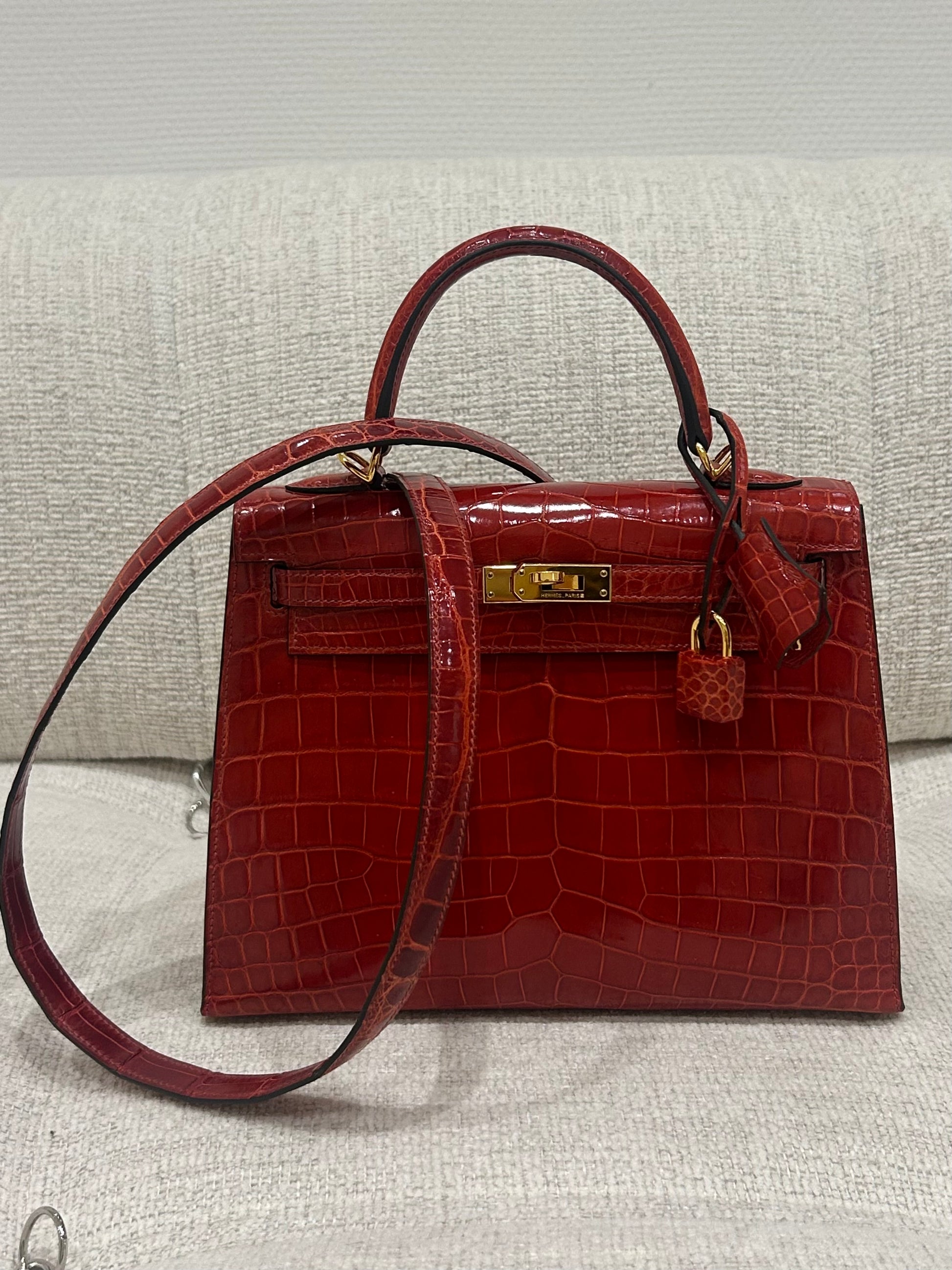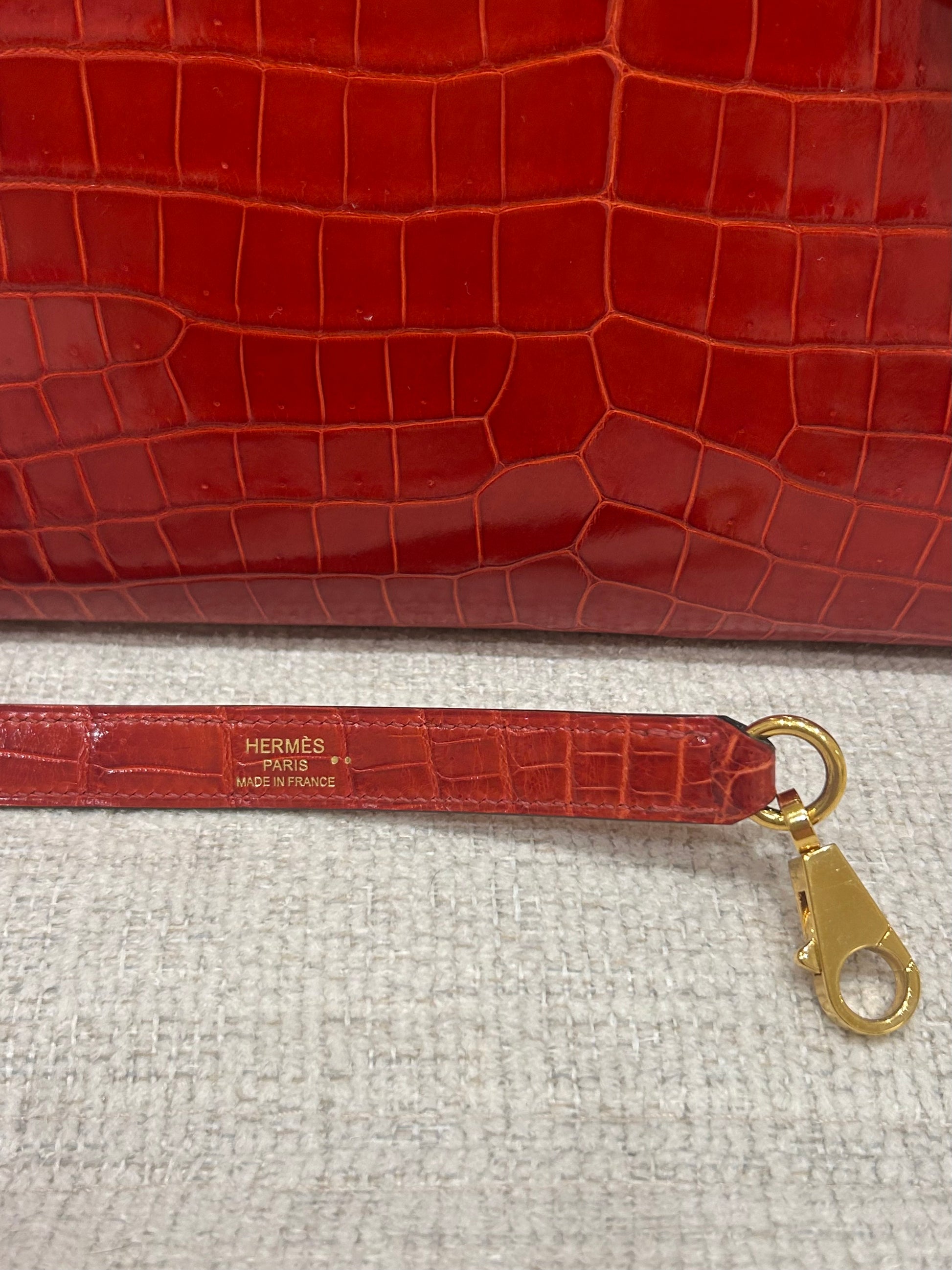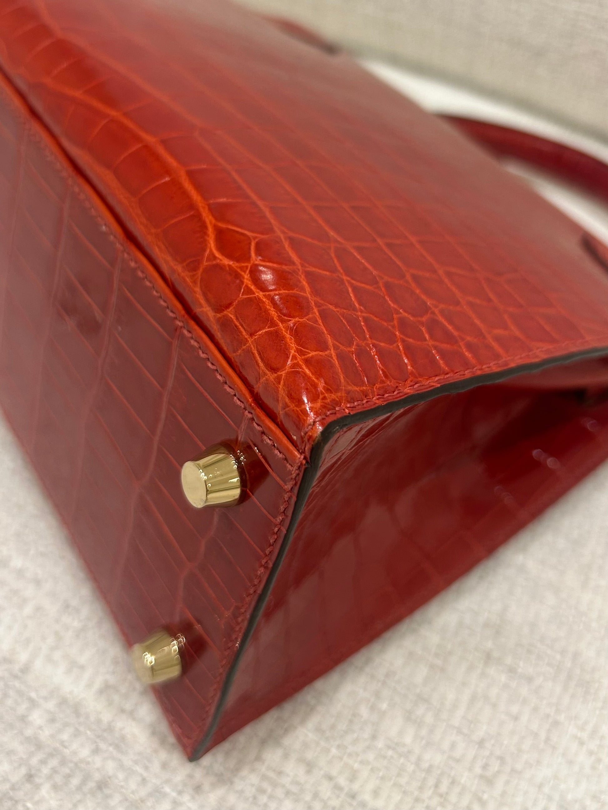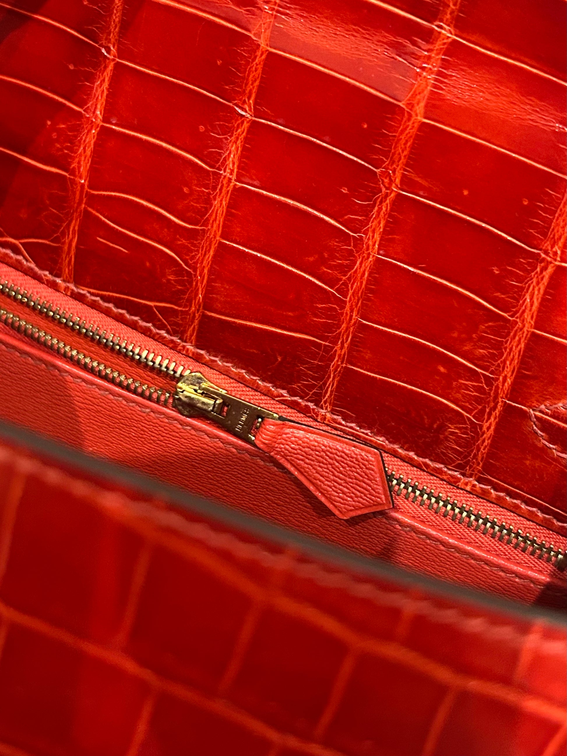 Kelly 25 in Orange Sanguine shiny crocodile with gold hardware. Sold with strap, padlock trimmed with leather, keys, clochette and dustbag.