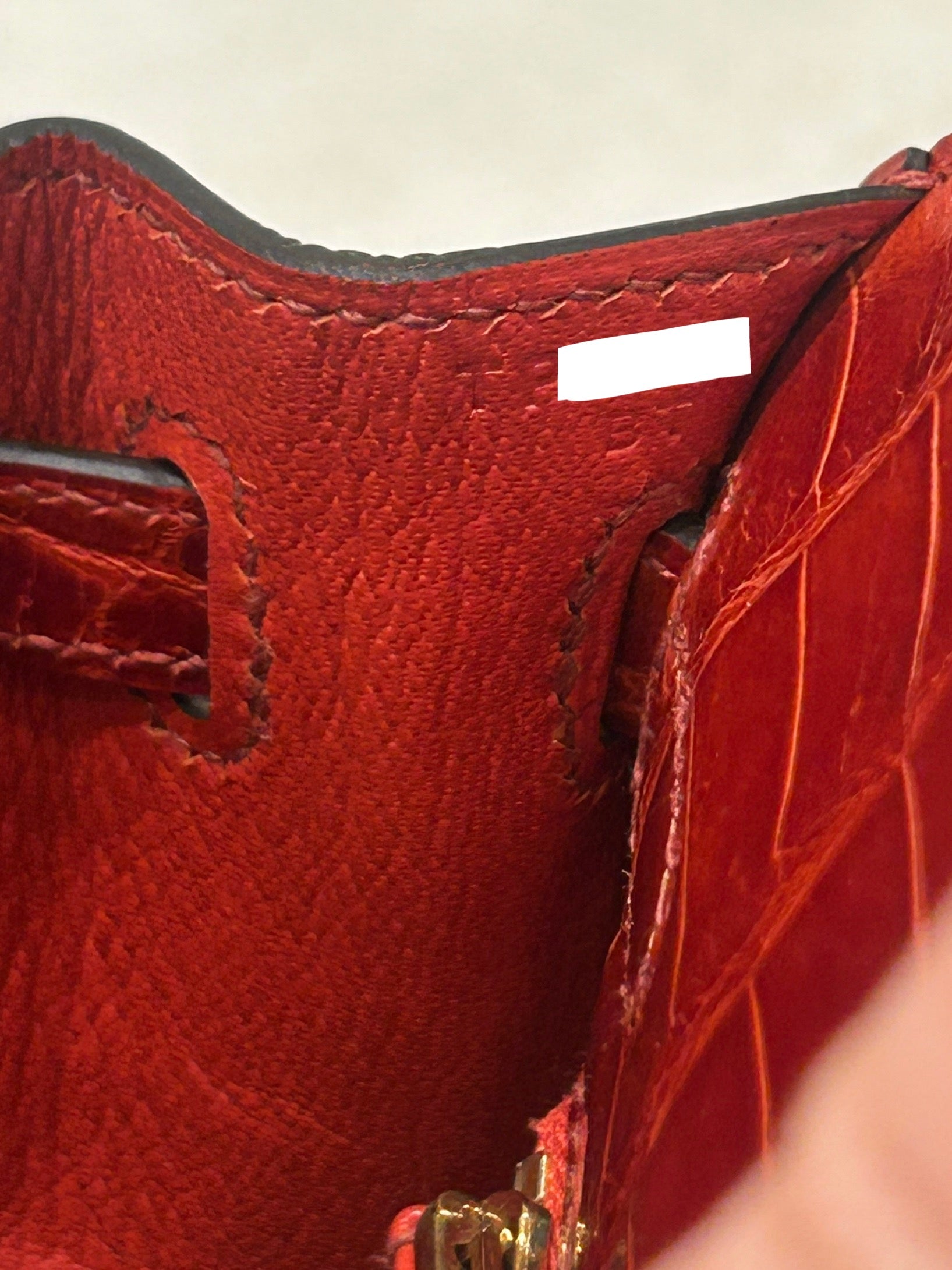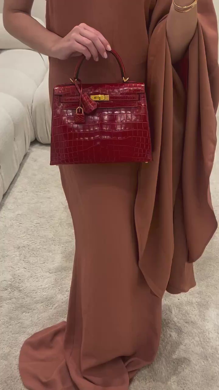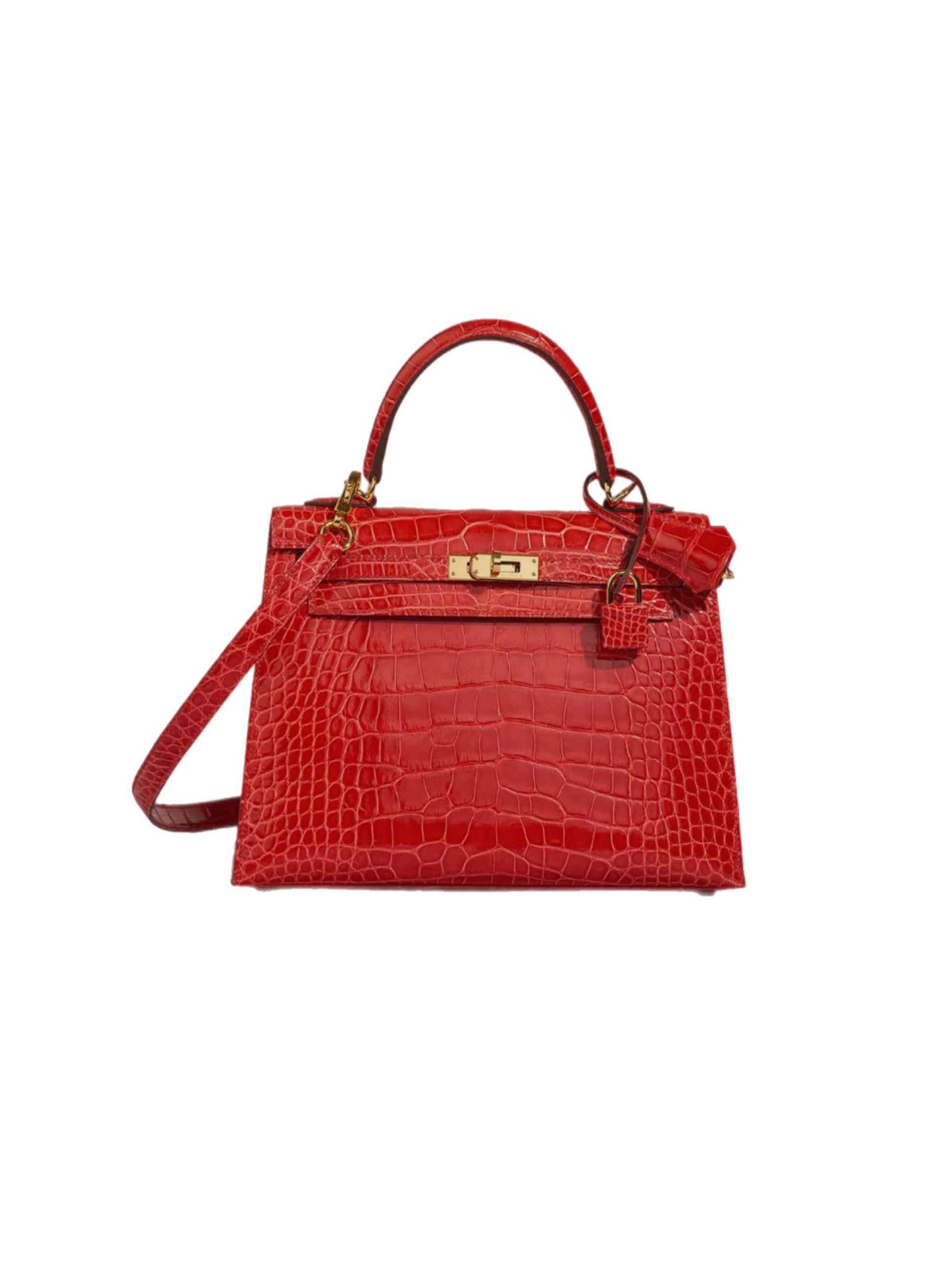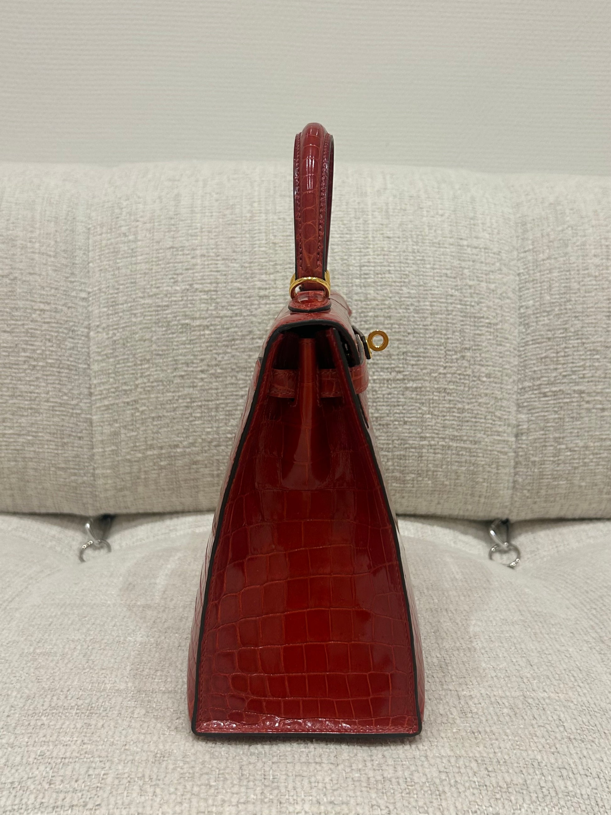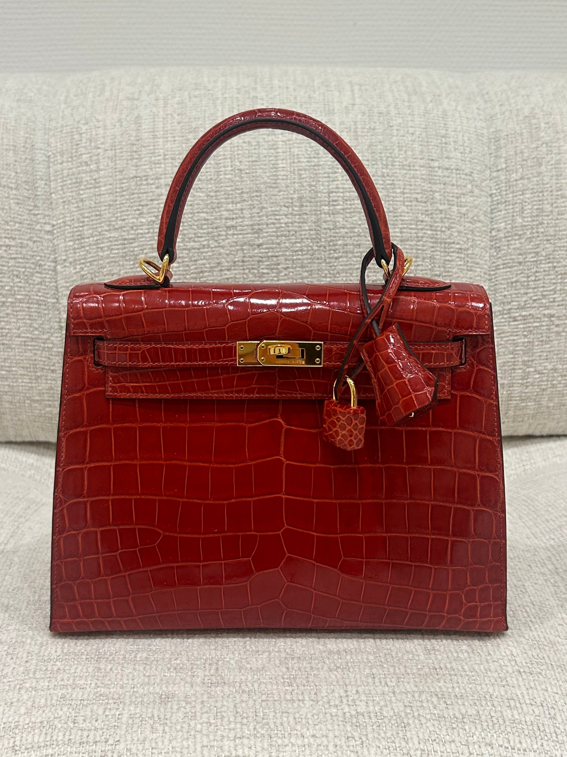 Kelly 25 in Orange Sanguine shiny crocodile with gold hardware. Sold with strap, padlock trimmed with leather, keys, clochette and dustbag.