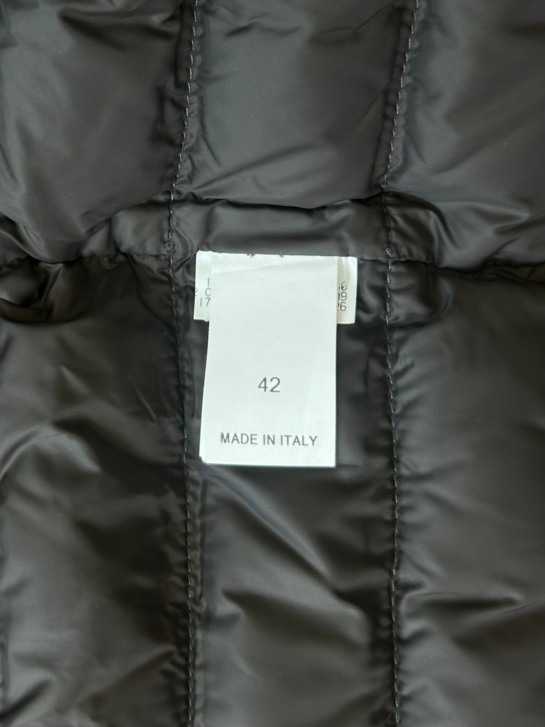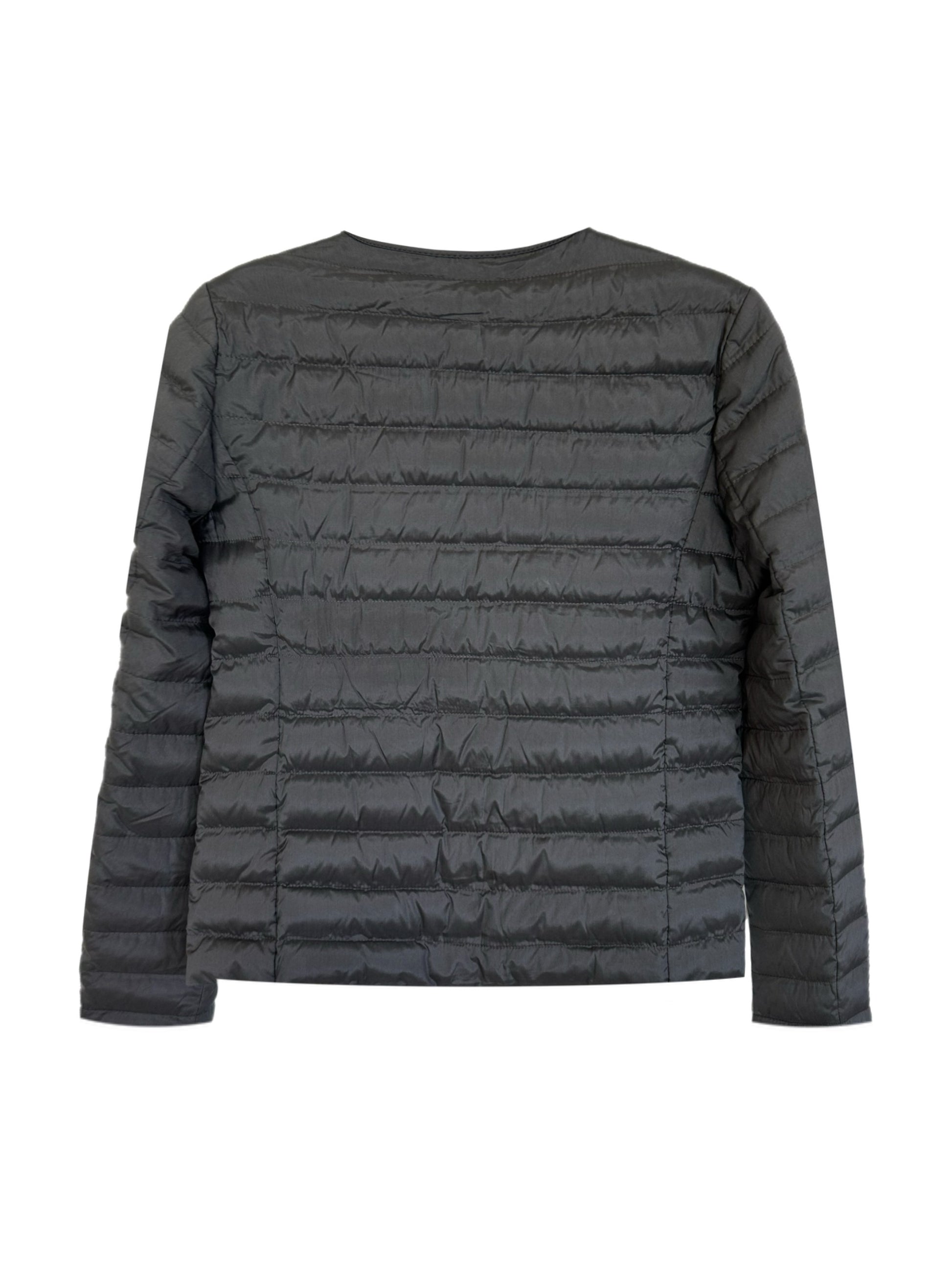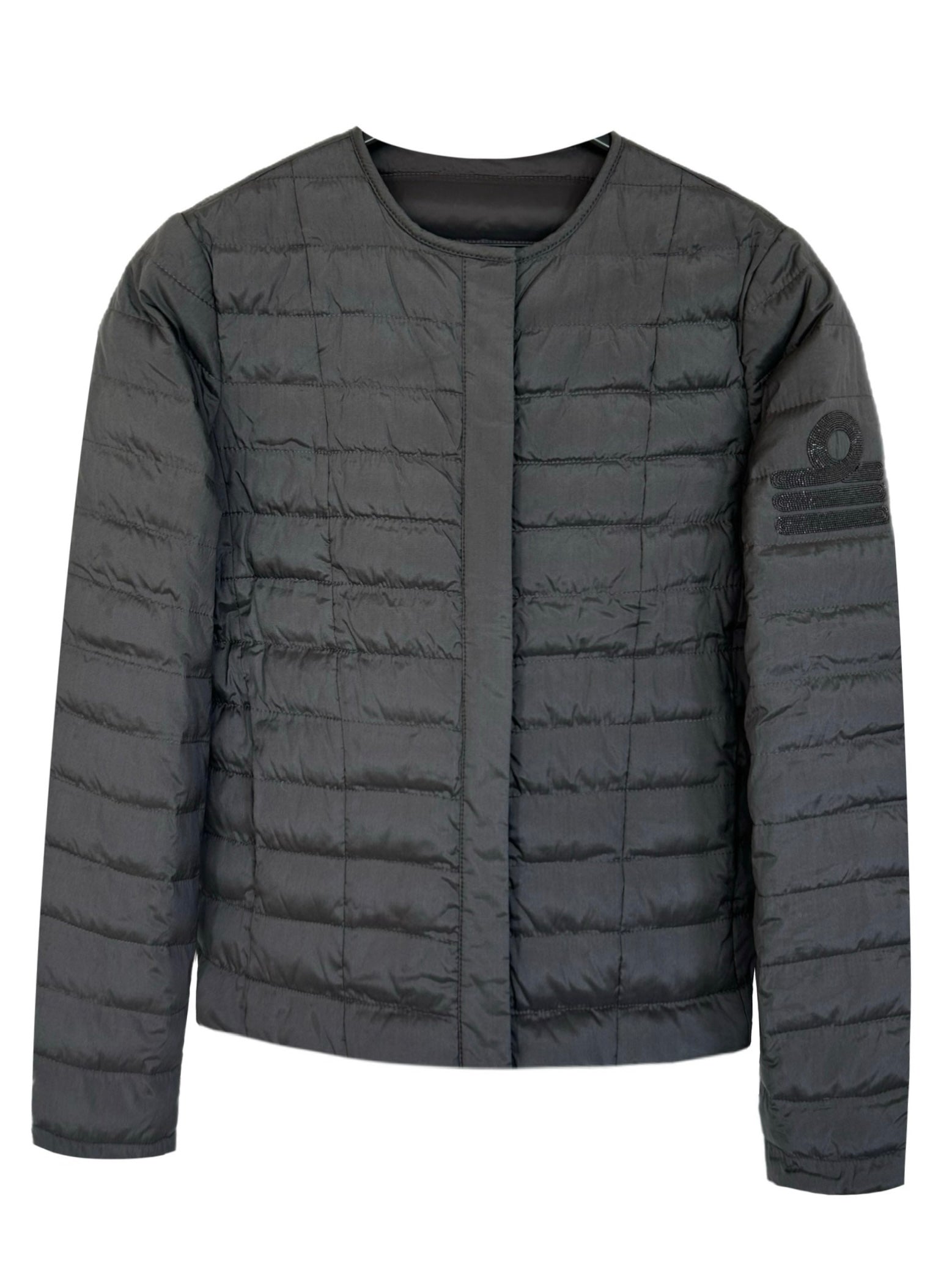 Light down jacket in anthracite grey silk with Monile beaded logo on one sleeve.