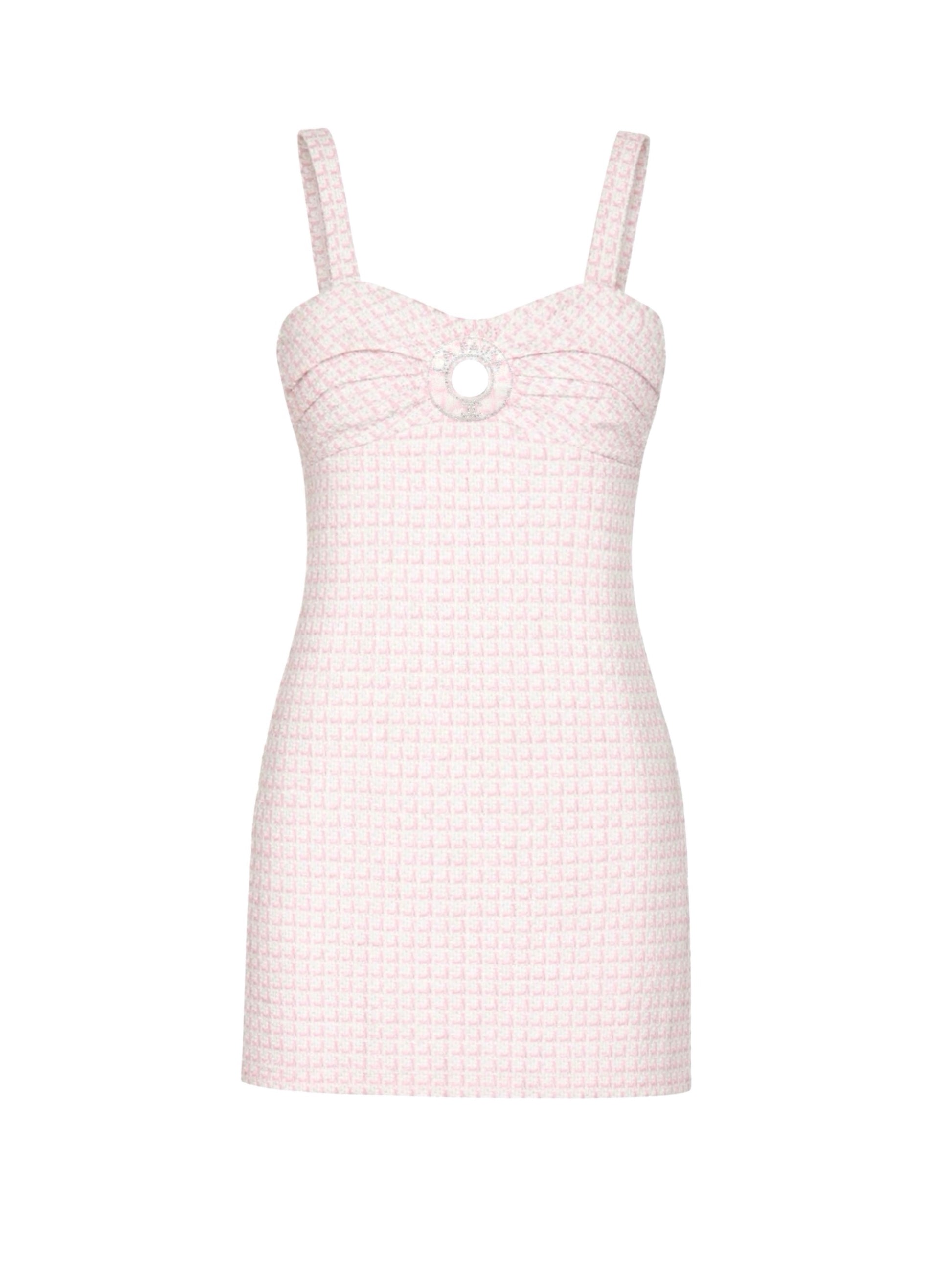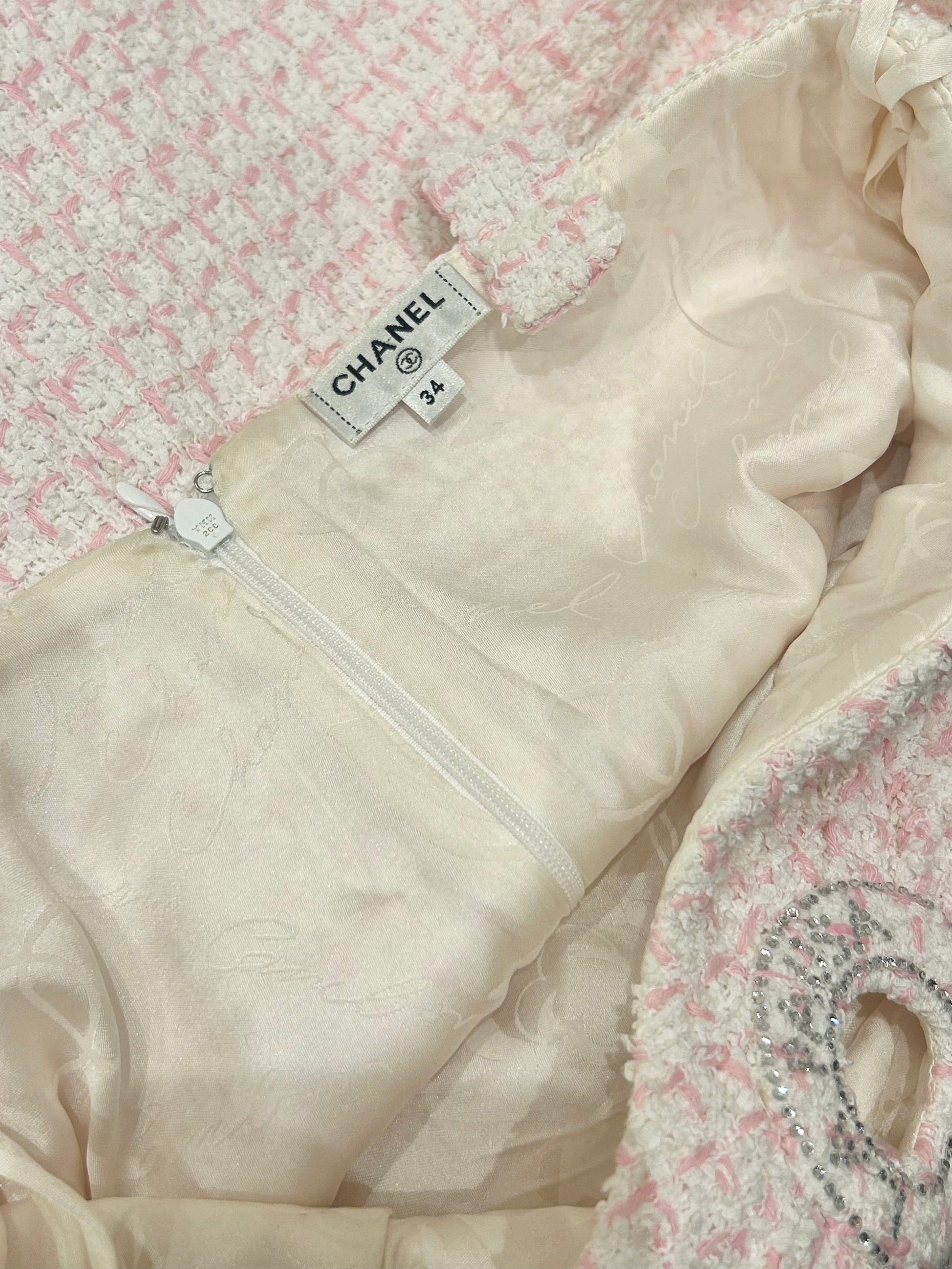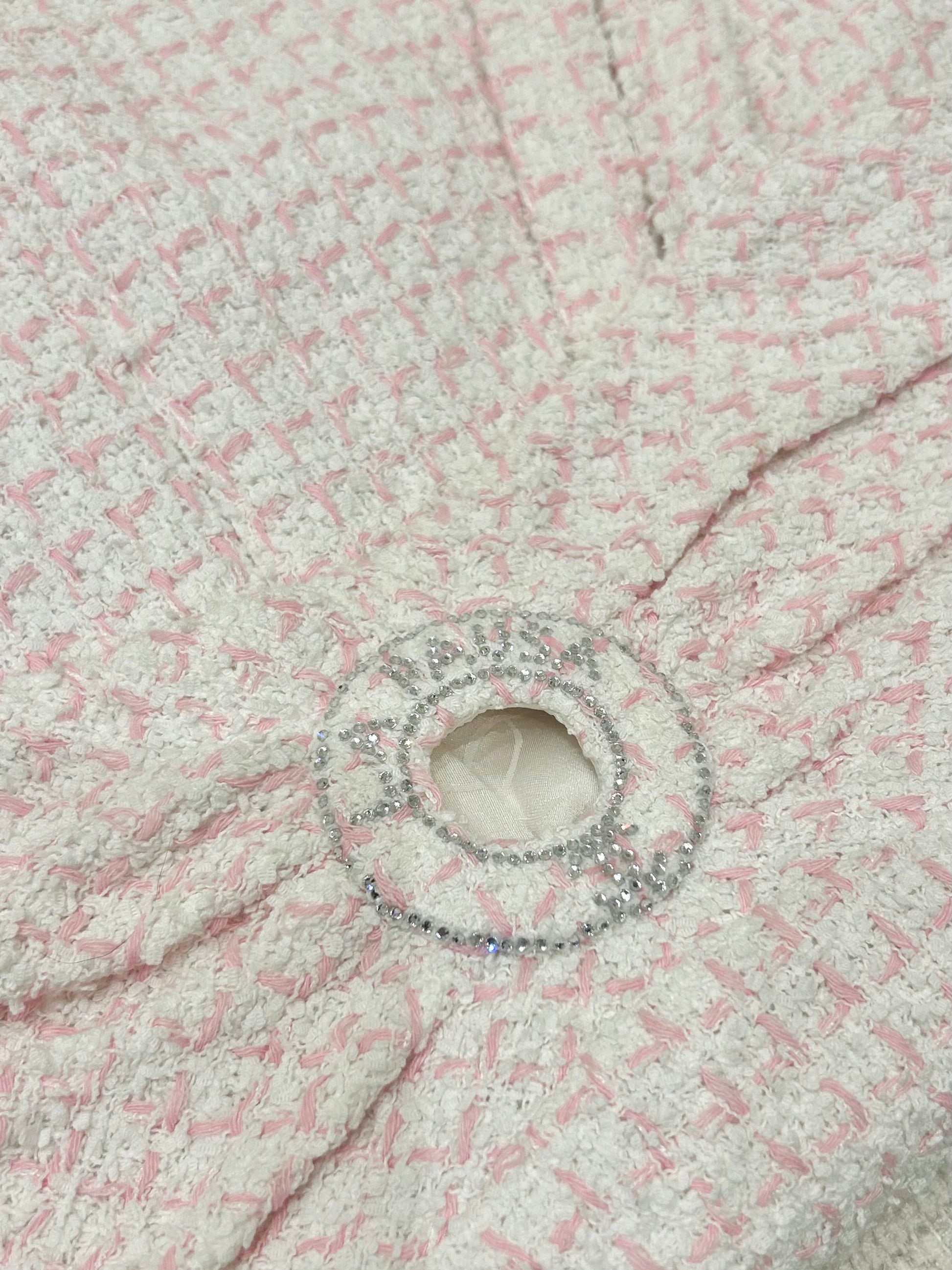 Pink and white tweed dress featuring an open circular detail at the center, adorned with rhinestones forming the “La Pausa” inscription and the iconic CC Chanel logo. Fully lined in silk.