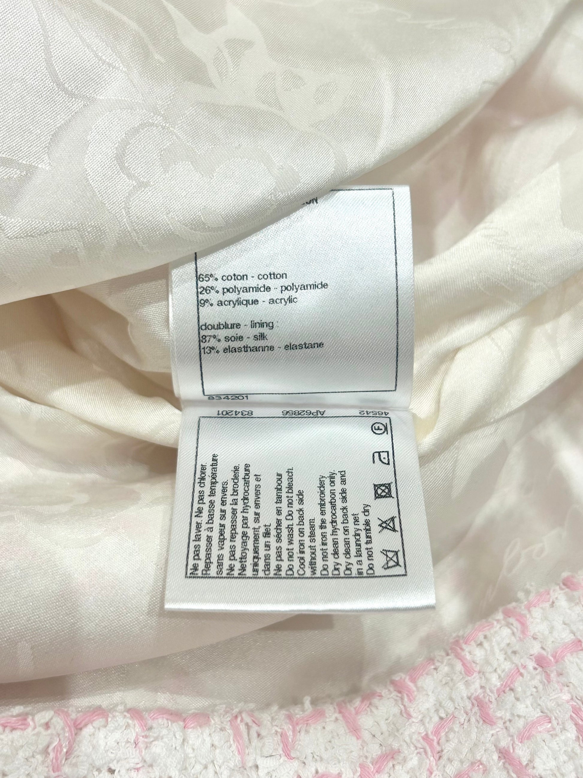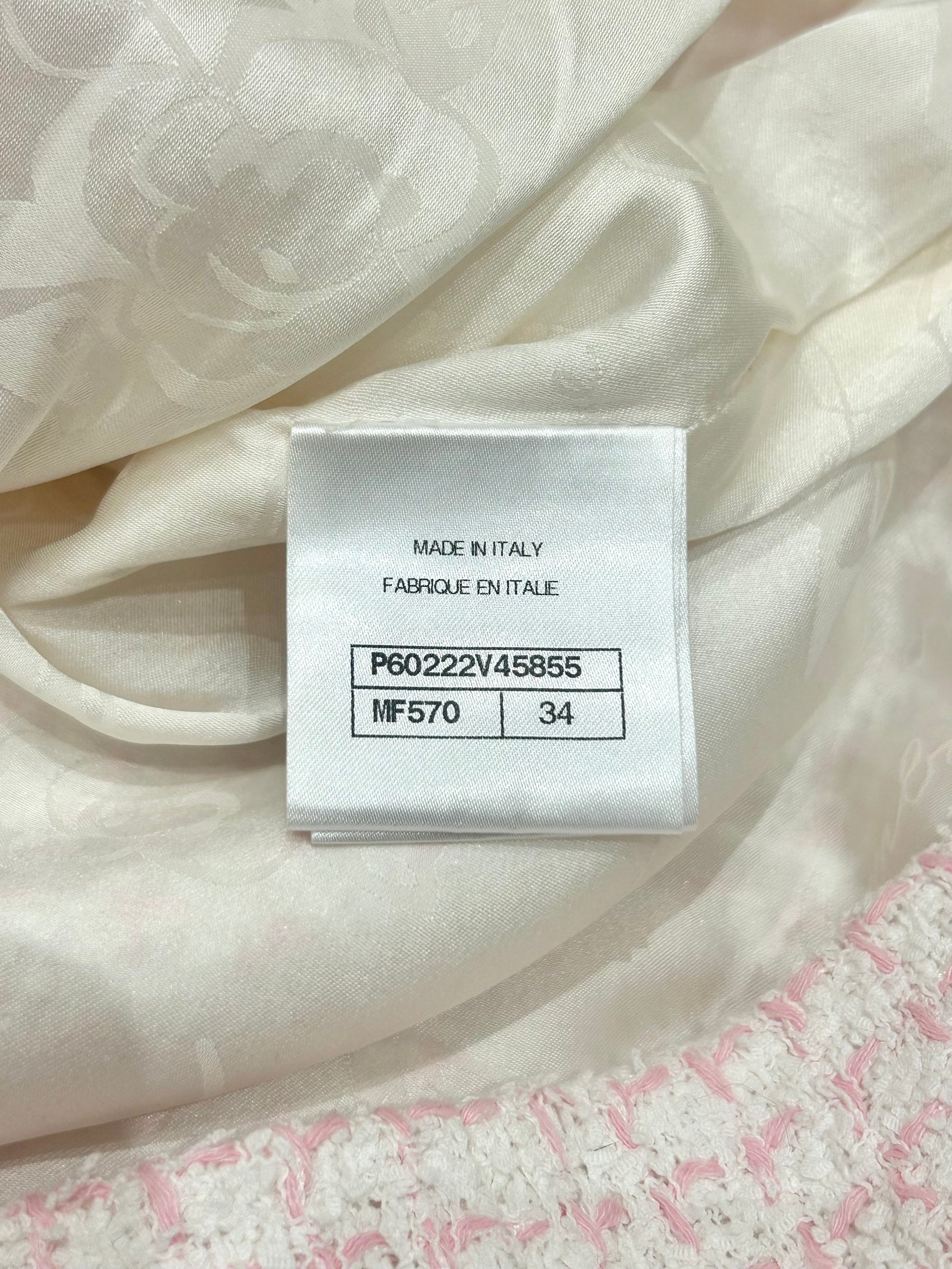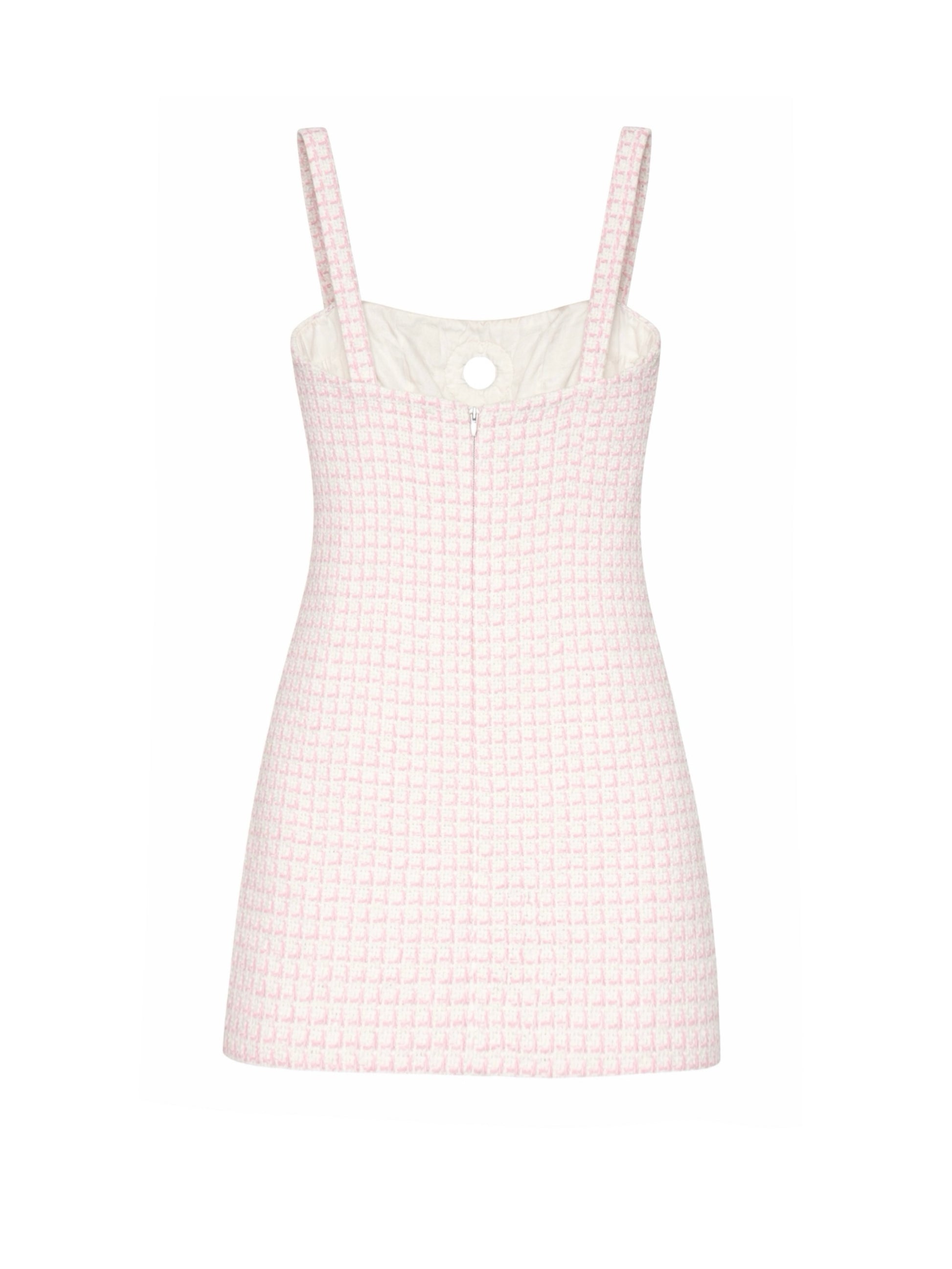 Pink and white tweed dress featuring an open circular detail at the center, adorned with rhinestones forming the “La Pausa” inscription and the iconic CC Chanel logo. Fully lined in silk.
