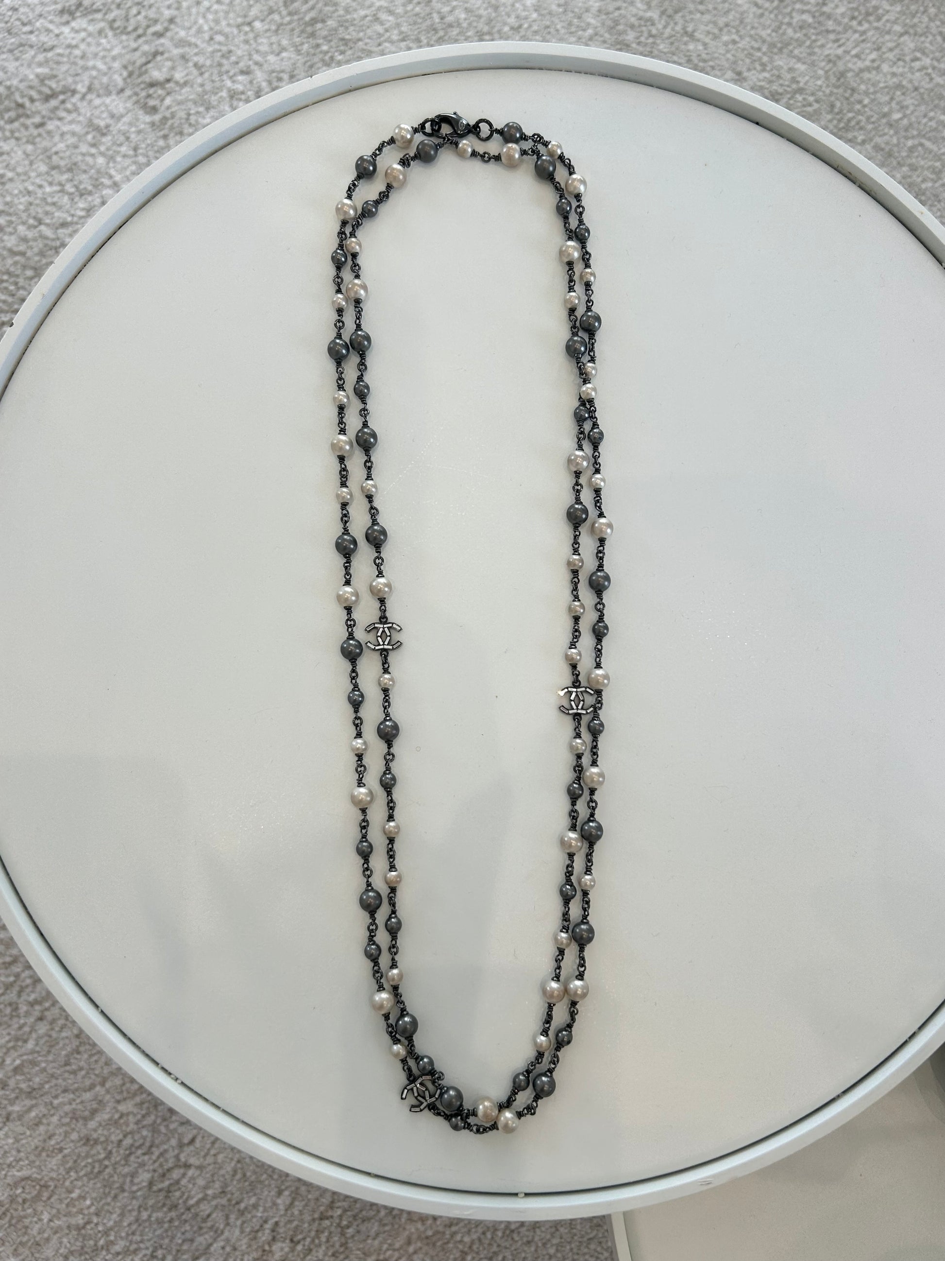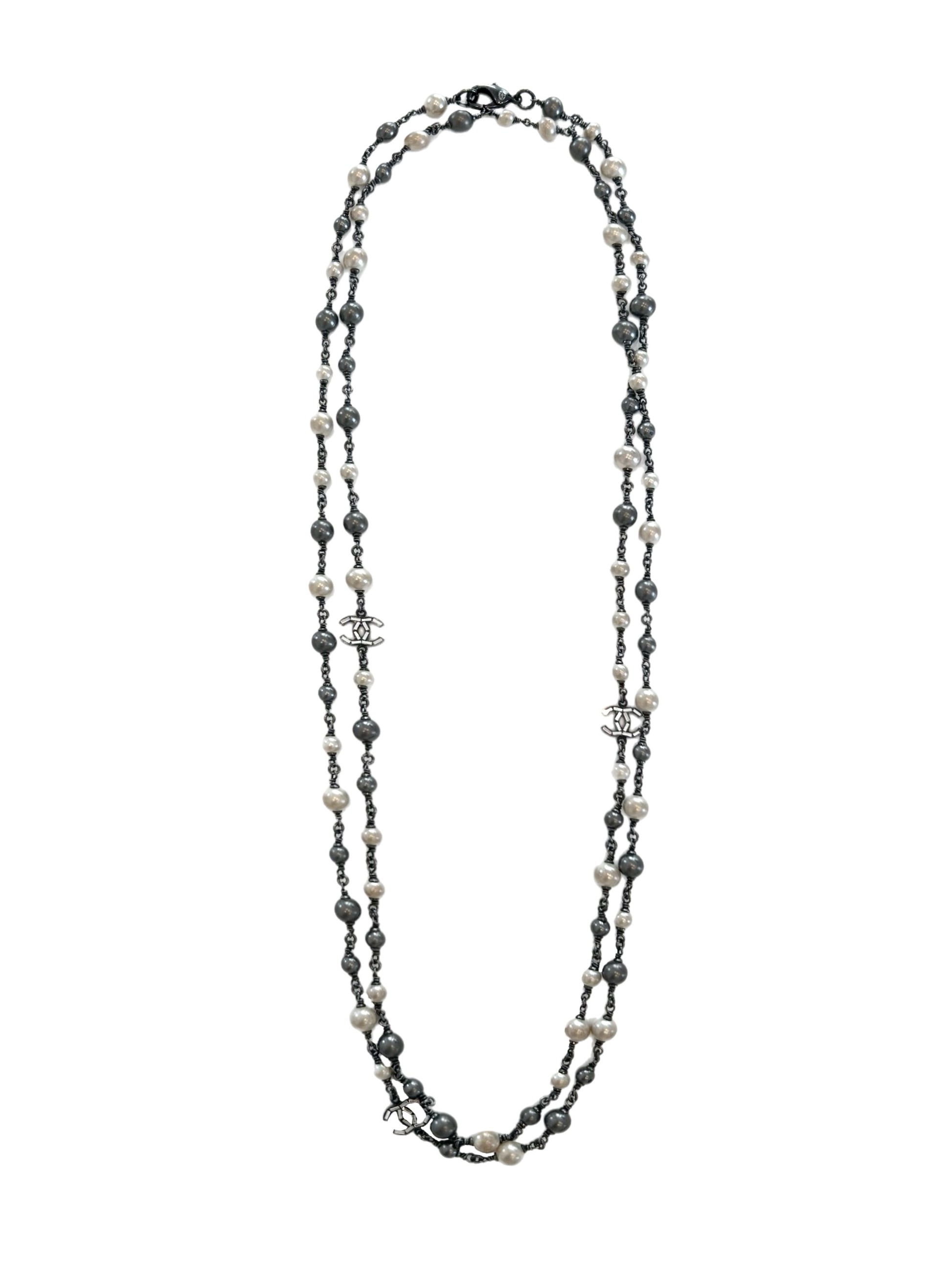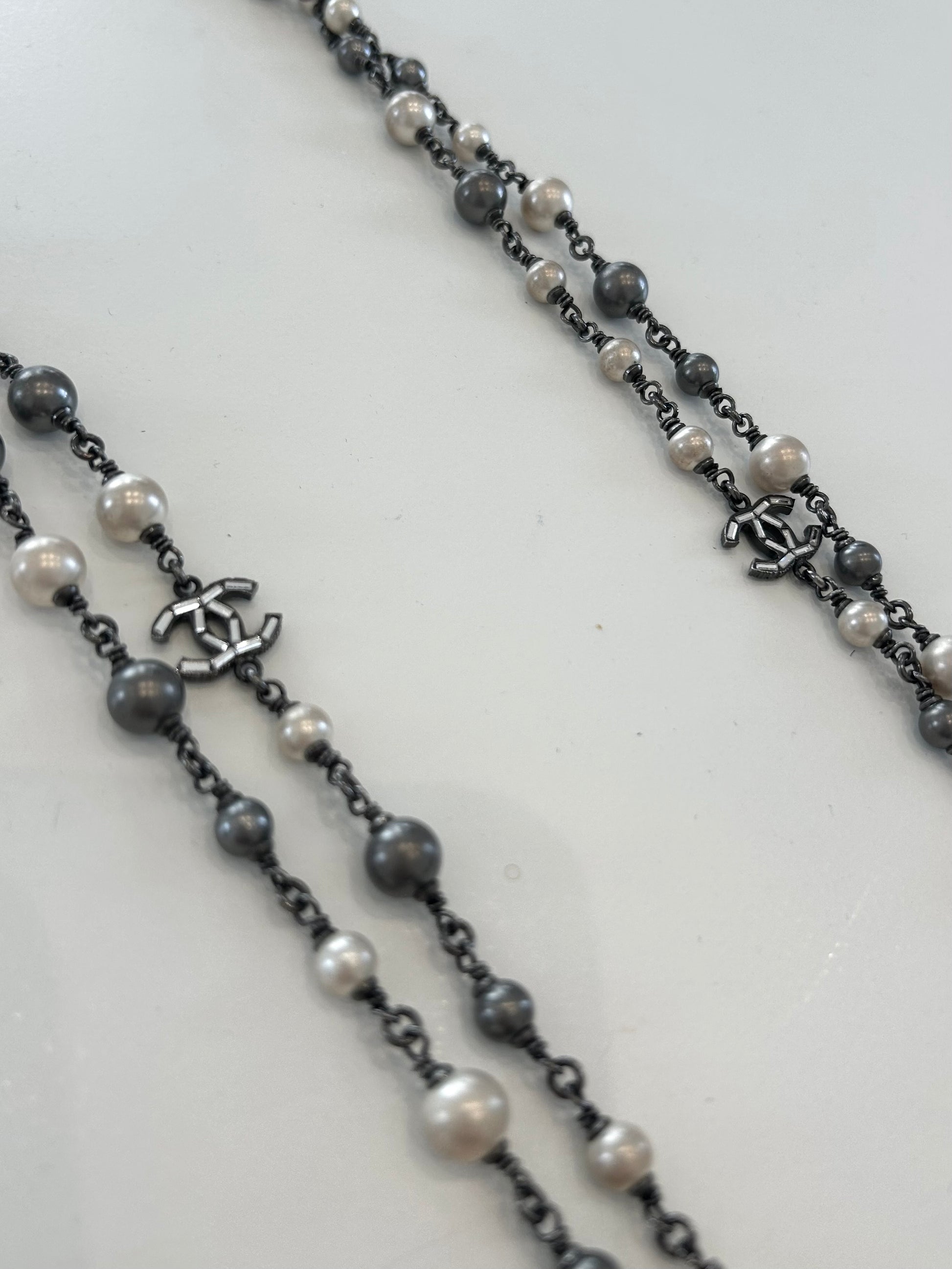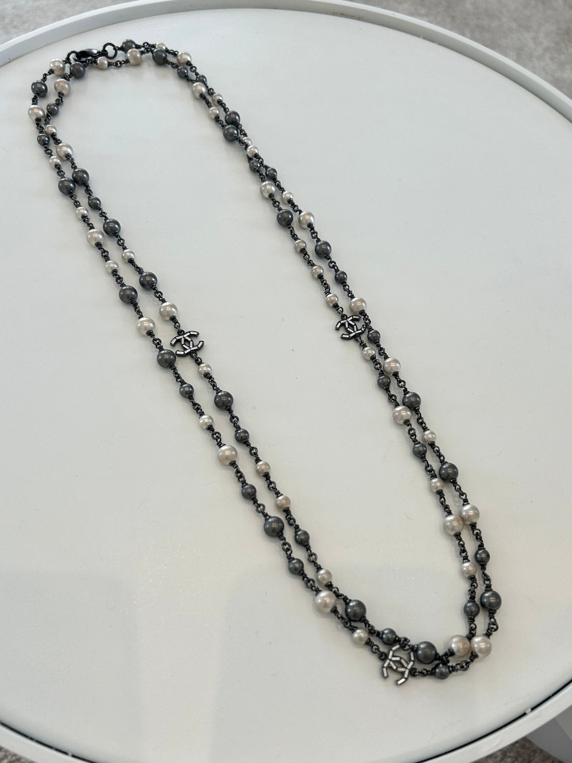 Double tour sautoir necklace featuring crystal CC and black and white pearls style