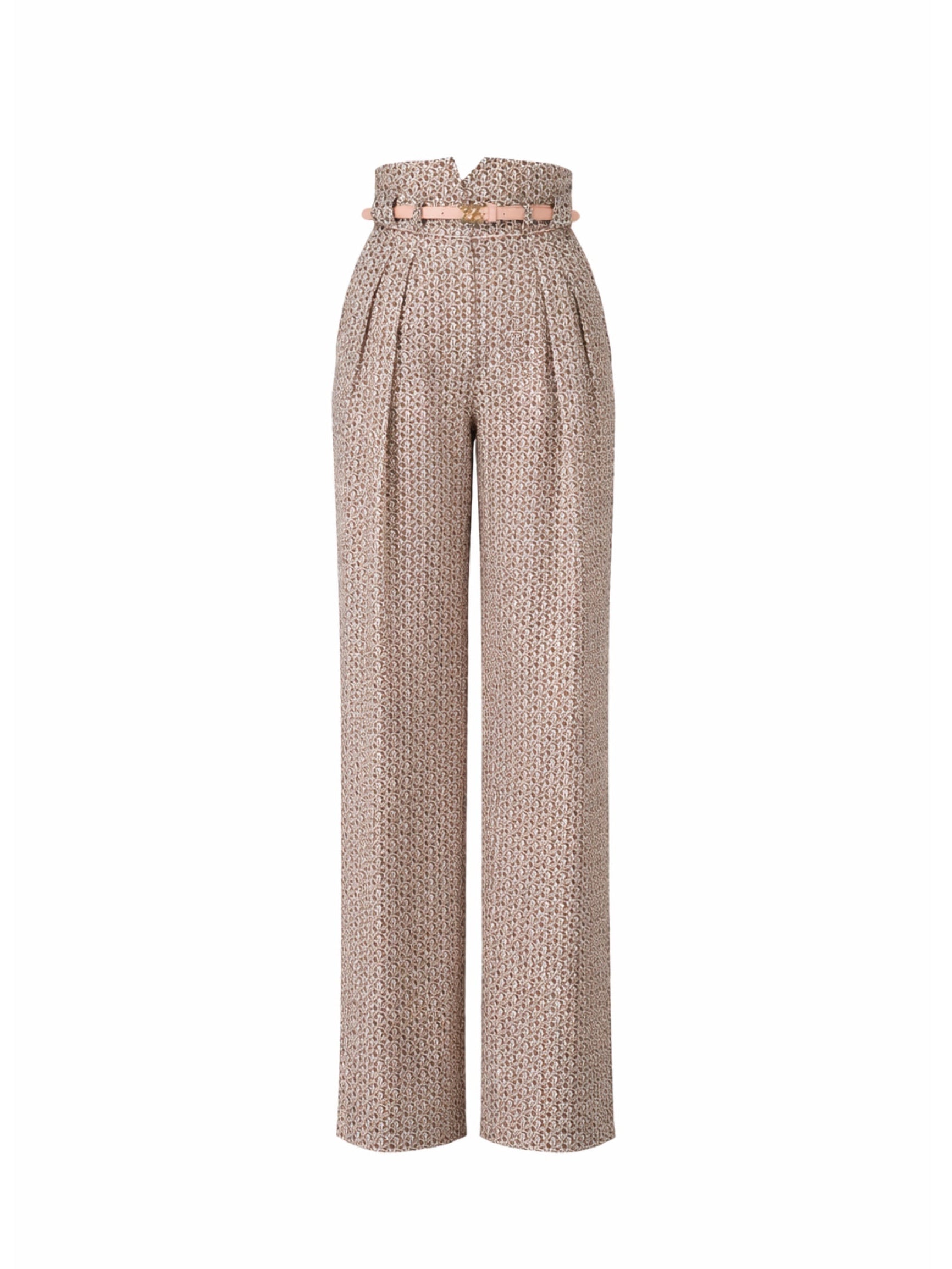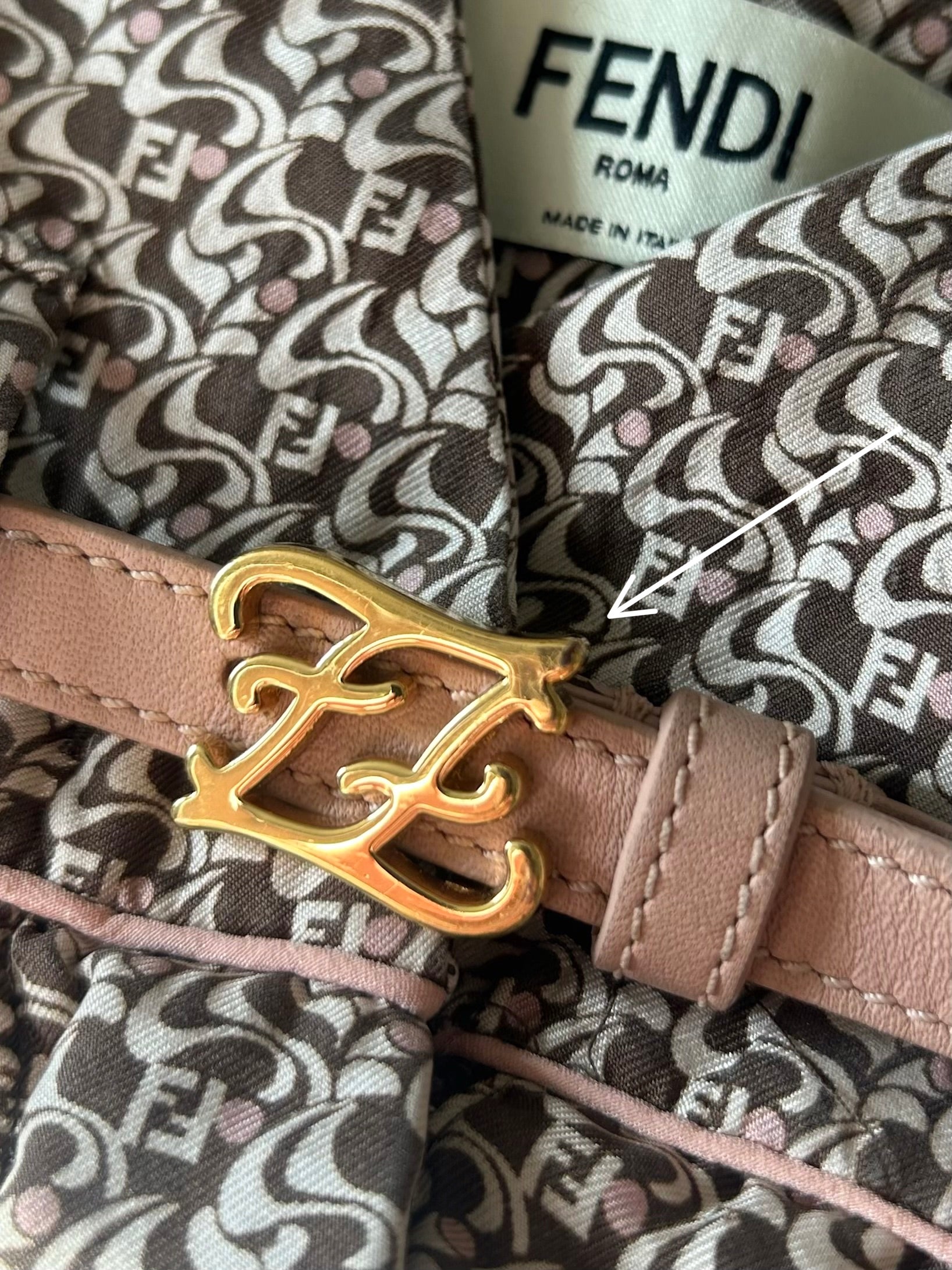 Silk trousers in a brown and soft blush pink print, featuring a leather belt with a gold-tone Fendi logo buckle.