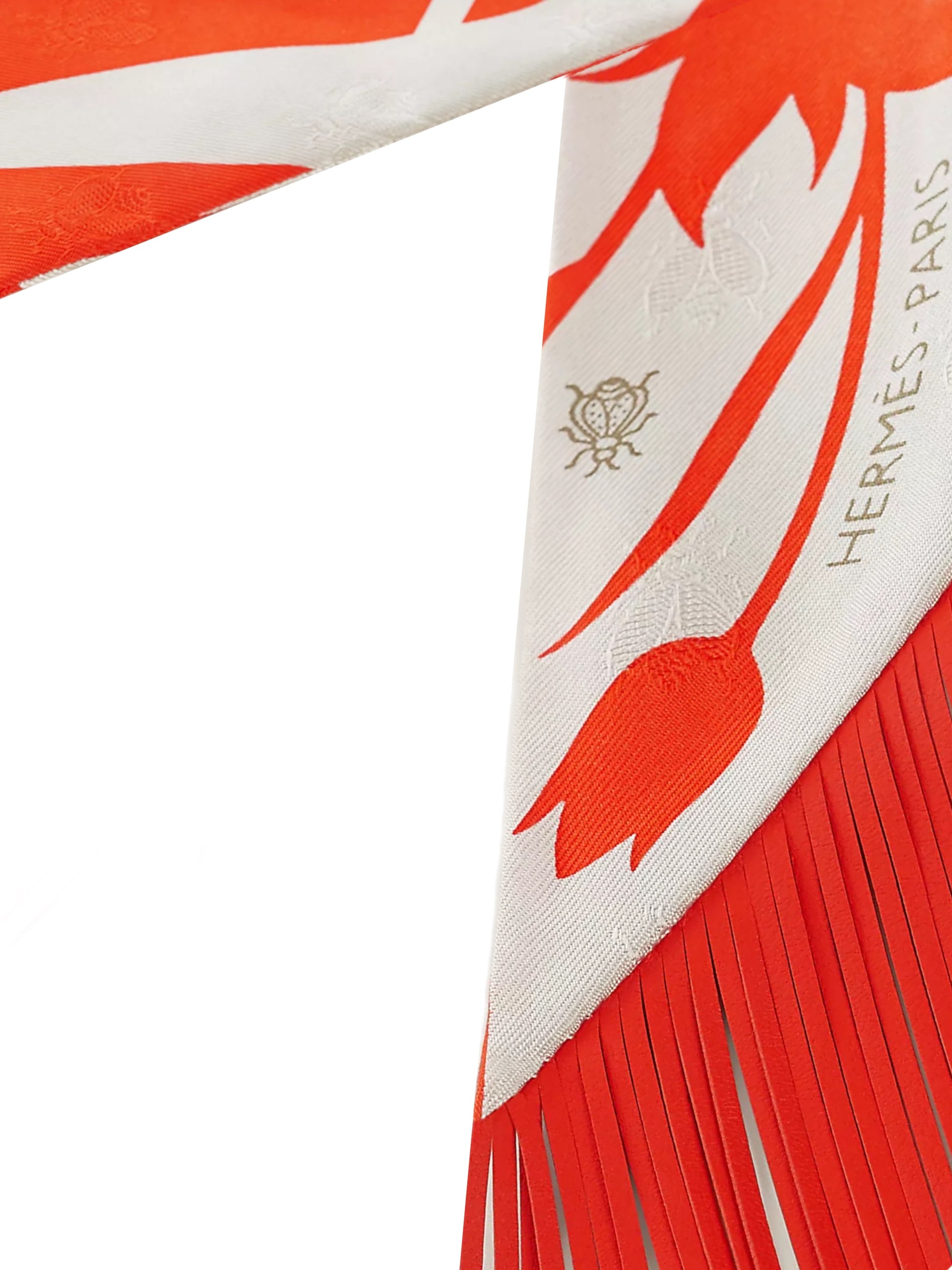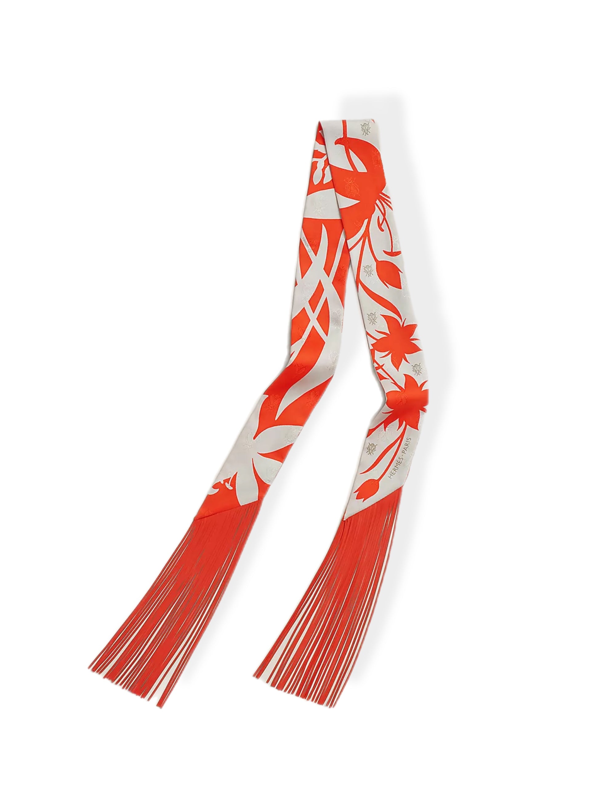 Twilly silk ribbon with leather fringes. Gris Perle / Vermillon.